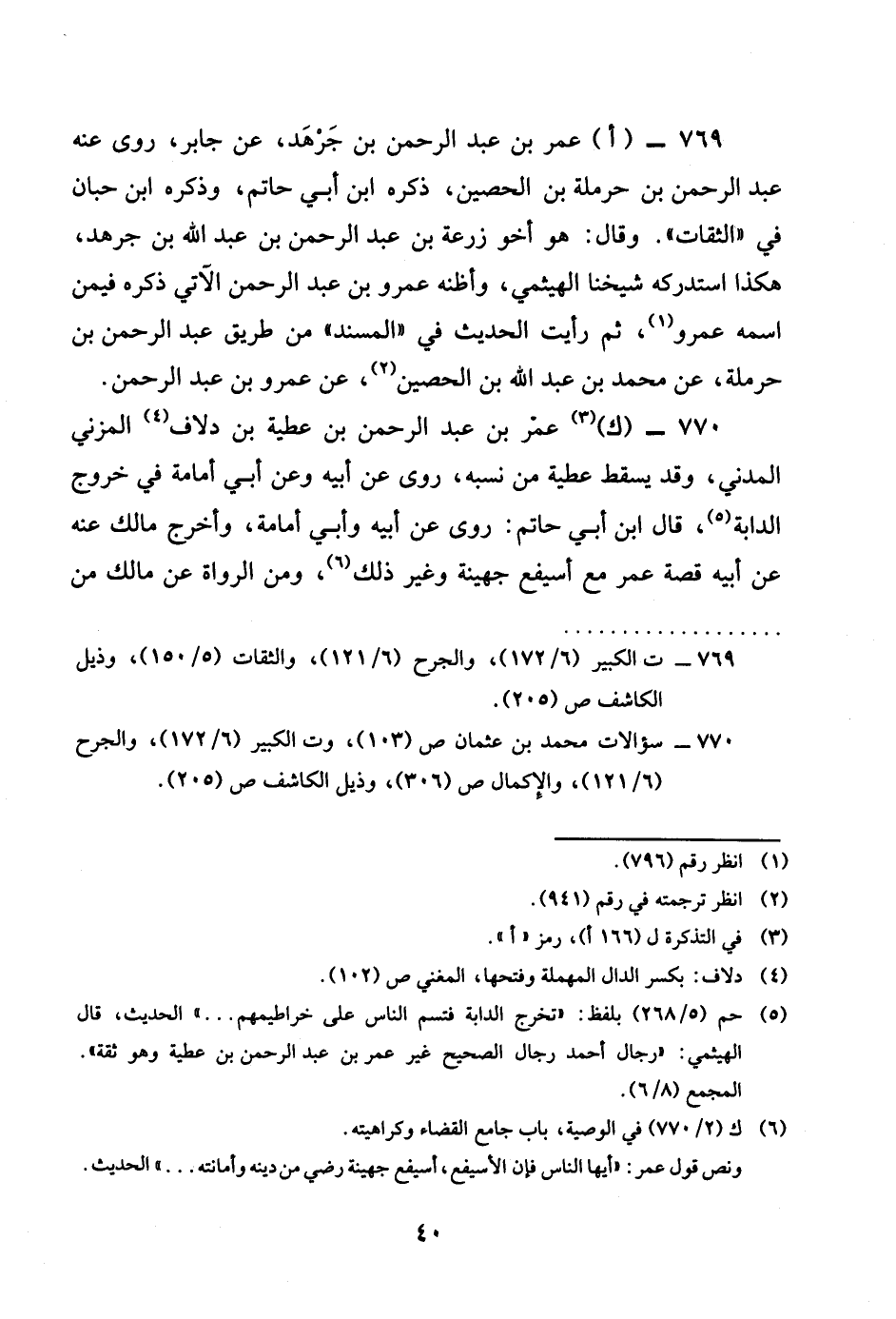 771 - اعمر بن عبد الرَّحْمَن بن جرهد عَن جَابر روى عَنهُ عبد الرَّحْمَن بن حَرْمَلَة بن الْحصين ذكره بن أبي حَاتِم وَذكره بن حبَان فِي الثِّقَات وَقَالَ هُوَ أَخُو زرْعَة بن عبد الرَّحْمَن بن عبد الله بن جرهد هَكَذَا استدركه شَيخنَا الهيثمي وَأَظنهُ عَمْرو بن عبد الرَّحْمَن الْآتِي ذكره فِي من اسْمه عَمْرو ثمَّ رَأَيْت الحَدِيث فِي الْمسند من طَرِيق عبد الرَّحْمَن بن حَرْمَلَة عَن مُحَمَّد بن عبد الله بن الْحصين عَن عَمْرو بن عبد الرَّحْمَن