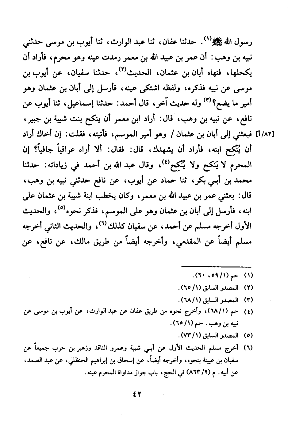 رَسُول الله صلى الله عَلَيْهِ وَسلم حَدثنَا عَفَّان ثَنَا عبد الْوَارِث ثَنَا أَيُّوب بن مُوسَى حَدثنِي نبيه بن وهب أَن عمر بن عبيد الله بن معمر رمدت عينه وَهُوَ محرم فَأَرَادَ أَن يكحلها فَنَهَاهُ أبان بن عُثْمَان الحَدِيث حَدثنَا سُفْيَان عَن أَيُّوب بن مُوسَى عَن نبيه فَذكره وَلَفظه اشْتَكَى عينه فَأرْسل إِلَى أبان بن عُثْمَان وَهُوَ أَمِير مَا يضع وَله حَدِيث آخر قَالَ أَحْمد حَدثنَا إِسْمَاعِيل حَدثنَا أَيُّوب عَن نَافِع عَن نبيه بن وهب قَالَ أَرَادَ بن معمر أَن ينْكح بنت شيبَة بن جُبَير فَبَعَثَنِي إِلَى أبان بن عُثْمَان وَهُوَ أَمِير الْمَوْسِم فَأَتَيْته فَقلت أَن أَخَاك أَرَادَ أَن ينْكح ابْنه فَأَرَادَ أَن يشهدك قَالَ فَقَالَ أَلا أرَاهُ عراقيا جَافيا إِن الْمحرم لَا ينْكح وَلَا ينْكح وَقَالَ عبد الله بن أَحْمد فِي زياداته حَدثنَا مُحَمَّد بن أبي بكر ثَنَا حَمَّاد عَن أَيُّوب عَن نَافِع حَدثنِي نبيه بن وهب قَالَ بَعَثَنِي عمر بن عبيد الله بن معمر وَكَانَ يخْطب ابْنة شيبَة بن عُثْمَان على ابْنه فَأرْسل إِلَى أبان بن عُثْمَان وَهُوَ على الْمَوْسِم فَذكر نَحوه والْحَدِيث الأول أخرجه مُسلم عَن أَحْمد عَن سُفْيَان كَذَلِك والْحَدِيث الثَّانِي أخرجه مُسلم أَيْضا عَن الْمقدمِي وَأخرجه أَيْضا من طَرِيق مَالك عَن نَافِع عَن