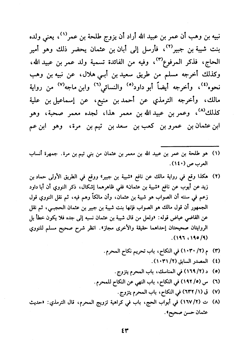 نبيه بن وهب أَن عمر بن عبيد الله أَرَادَ أَن يُزَوّج طَلْحَة بن عمر يَعْنِي وَلَده بنت شيبَة بن جُبَير فَأرْسل إِلَى أبان بن عُثْمَان يحضر ذَلِك وَهُوَ أَمِير الْحَاج فَذكر الْمَرْفُوع وَفِيه من الْفَائِدَة تَسْمِيَة ولد عمر بن عبيد الله وَكَذَلِكَ أخرجه مُسلم من طَرِيق سعيد بن أبي هِلَال عَن نبيه بن وهب نَحوه وَأخرجه أَيْضا أَبُو دَاوُد وَالنَّسَائِيّ وَابْن ماجة من رِوَايَة مَالك وَأخرجه التِّرْمِذِيّ عَن أَحْمد بن منيع عَن إِسْمَاعِيل بن علية كَذَلِك وَعمر بن عبيد الله بن معمر هَذَا لجده معمر صُحْبَة وَهُوَ بن عُثْمَان بن عَمْرو بن كَعْب بن سعد بن تيم بن مرّة وَهُوَ بن عَم