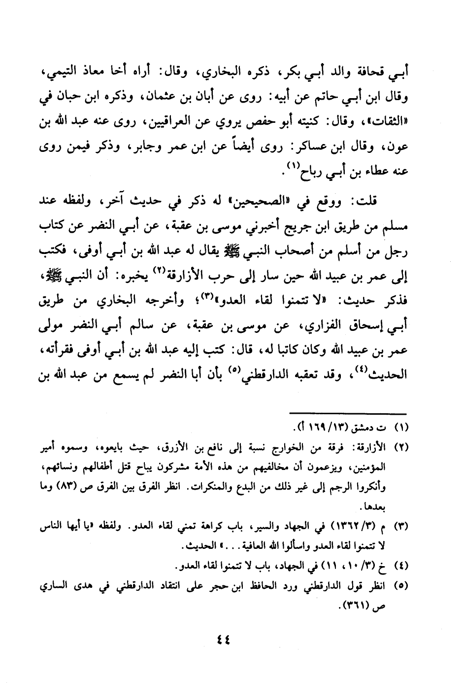 أبي قُحَافَة وَالِد أبي بكر رضى الله تَعَالَى عَنْهُم ذكره البُخَارِيّ وَقَالَ أرَاهُ أَخا معَاذ التَّيْمِيّ وَقَالَ أبن أبي حَاتِم عَن أَبِيه روى عَن أبان بن عُثْمَان وَذكره بن حبَان فِي الثِّقَات وَقَالَ كنيته أَبُو حَفْص يرْوى عَن الْعِرَاقِيّين روى عَنهُ عبد الله بن عون وَقَالَ بن عَسَاكِر روى أَيْضا عَن بن عمر وَجَابِر وَذكر فِي من روى عَنهُ عَطاء بن أبي رَبَاح قلت وَوَقع فِي الصَّحِيحَيْنِ لَهُ ذكر فِي حَدِيث آخر وَلَفظه عِنْد مُسلم من طَرِيق بن جريج أَخْبرنِي مُوسَى بن عقبَة عَن أبي النَّضر عَن كتاب رجل من أسلم من أَصْحَاب النَّبِي صلى الله عَلَيْهِ وَسلم يُقَال لَهُ عبد الله بن أبي أوفى فَكتب إِلَى عمر بن عبيد الله حِين سَار إِلَى حَرْب الْأزَارِقَة يُخبرهُ أَن النَّبِي صلى الله عَلَيْهِ وَسلم فَذكر حَدِيث لَا تَتَمَنَّوْا لِقَاء الْعَدو وَأخرجه البُخَارِيّ من طَرِيق أبي إِسْحَاق الْفَزارِيّ عَن مُوسَى بن عقبَة عَن سَالم أبي النَّضر مولى عمر بن عبيد الله وَكَانَ كَاتبا لَهُ قَالَ كتب إِلَيْهِ عبد الله بن أبي أوفى فَقَرَأته الحَدِيث وَقد تعقبه الدَّارَقُطْنِيّ بِأَن أَبَا النَّضر لم يسمع من عبد الله بن