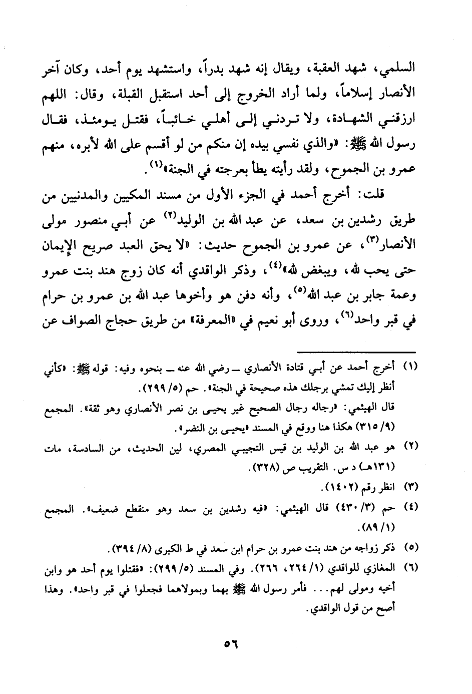 السّلمِيّ رضى الله تَعَالَى عَنهُ شهد الْعقبَة وَيُقَال أَنه شهد بَدْرًا وَاسْتشْهدَ يَوْم أحد وَكَانَ آخر الْأَنْصَار إسلاما وَلما أَرَادَ الْخُرُوج إِلَى أحد اسْتقْبل الْقبْلَة وَقَالَ اللَّهُمَّ ارزقني الشَّهَادَة وَلَا تردني إِلَى أَهلِي خائبا فَقتل يَوْمئِذٍ فَقَالَ رَسُول الله صلى الله عَلَيْهِ وَسلم وَالَّذِي نَفسِي بِيَدِهِ أَن مِنْكُم من لَو أقسم على الله لَأَبَره مِنْهُم عَمْرو بن الجموح وَلَقَد رَأَيْته يطَأ بعرجته فِي الْجنَّة قلت أخرج أَحْمد فِي الْجُزْء الأول من مُسْند المكيين والمدنيين من طَرِيق رشدين بن سعد عَن عبد الله بن الْوَلِيد عَن أبي مَنْصُور مولى الْأَنْصَار عَن عَمْرو بن الجموح حَدِيث لَا يحِق العَبْد صَرِيح الْإِيمَان حَتَّى يحب لله وَيبغض لله وَذكر الْوَاقِدِيّ أَنه كَانَ زوح هِنْد بنت عَمْرو وعمة جَابر بن عبد الله وَأَنه دفن هُوَ وأخوها عبد الله بن عَمْرو بن حرَام فِي قبر وَاحِد وروى أَبُو نعيم فِي الْمعرفَة من طَرِيق حجاج الصَّواف عَن