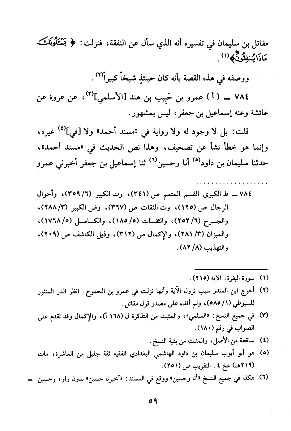 قلت بل لَا وجود لَهُ وَلَا رِوَايَة فِي مُسْند أَحْمد وَلَا فِي غَيره وَإِنَّمَا هُوَ خطأ نَشأ عَن تَصْحِيف وَهَذَا نَص الحَدِيث فِي مُسْند أَحْمد حَدثنَا سُلَيْمَان بن دَاوُد أَنا وحسين ثَنَا إِسْمَاعِيل بن جَعْفَر أَخْبرنِي عَمْرو