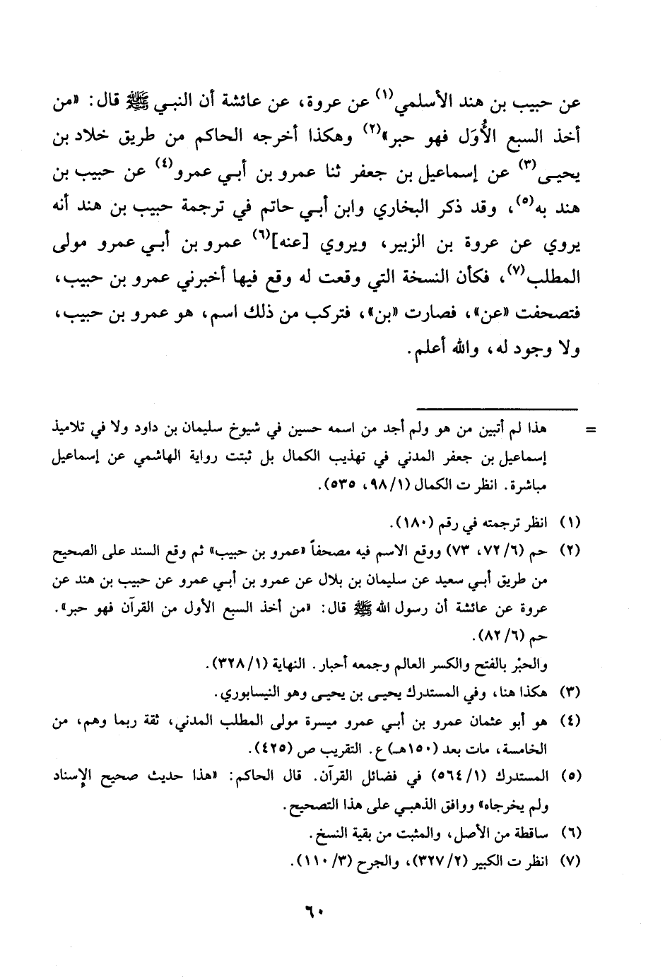 عَن حبيب بن هِنْد الْأَسْلَمِيّ عَن عُرْوَة عَن عَائِشَة رضى الله تَعَالَى عَنْهَا أَن النَّبِي صلى الله عَلَيْهِ وَسلم قَالَ من أَخذ السَّبع الأول فَهُوَ حبر وَهَكَذَا أخرجه الْحَاكِم من طَرِيق خَلاد بن يحيى عَن إِسْمَاعِيل بن جَعْفَر ثَنَا عَمْرو بن أبي عَمْرو عَن حبيب بن هِنْد بِهِ وَقد ذكر البُخَارِيّ وَابْن أبي حَاتِم فِي تَرْجَمَة حبيب بن هِنْد أَنه يروي عَن عُرْوَة بن الزبير ويروي عَنهُ عَمْرو بن أبي عَمْرو مولى الْمطلب فَكَأَن النُّسْخَة الَّتِي وَقعت لَهُ وَقع فِيهَا أَخْبرنِي عَمْرو بن حبيب فتصحفت عَن فَصَارَت بن فتركب من ذَلِك اسْم هُوَ عَمْرو بن حبيب وَلَا وجود لَهُ وَالله أعلم
