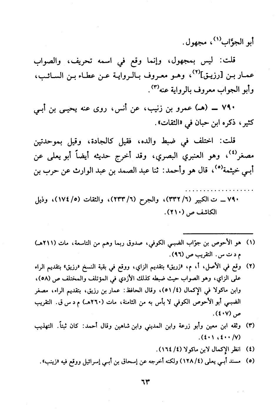 791 - هَب عَمْرو بن زنيب عَن أنس روى عَنهُ يحيى بن كثير ذكره بن حبَان فِي الثِّقَات قلت اخْتلف فِي ضبط وَالِده فَقيل كالجادة وَقيل بموحدتين مصغر وَهُوَ الْعَنْبَري الْبَصْرِيّ وَقد أخرج حَدِيثه أَيْضا أَبُو يعلى عَن أبي خَيْثَمَة قَالَ هُوَ وَأحمد ثَنَا عبد الصَّمد بن عبد الْوَارِث عَن حَرْب بن