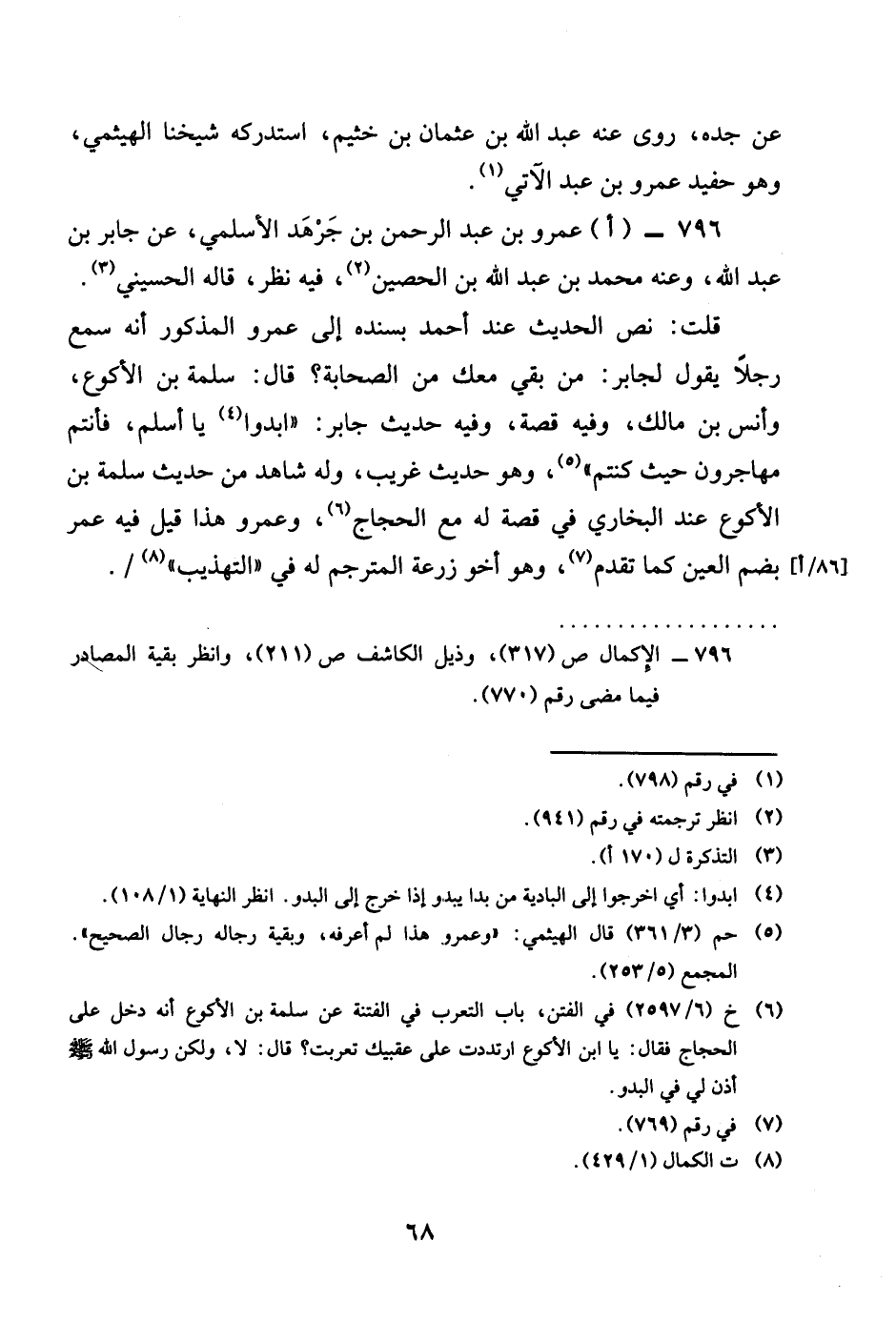 797 - اعَمْرو بن عبد الرَّحْمَن بن جرهد الْأَسْلَمِيّ عَن جَابر بن عبد الله وَعنهُ مُحَمَّد بن عبد الله بن الْحصين فِيهِ نظر قَالَه الْحُسَيْنِي قلت نَص الحَدِيث عِنْد أَحْمد بِسَنَدِهِ إِلَى عَمْرو الْمَذْكُور أَنه سمع رجلا يَقُول لجَابِر من بَقِي مَعَك من الصَّحَابَة قَالَ سَلمَة بن الْأَكْوَع وَأنس بن مَالك وَفِيه قصَّة وَفِيه حَدِيث جَابر ابدوا يَا أسلم فَأنْتم مهاجرون حَيْثُ كُنْتُم وَهُوَ حَدِيث غَرِيب وَله شَاهد من حَدِيث سَلمَة بن الْأَكْوَع عِنْد البُخَارِيّ فِي قصَّة لَهُ مَعَ الْحجَّاج وَعَمْرو هَذَا قيل فِيهِ عمر بِضَم الْعين كَمَا تقدم وَهُوَ أَخُو زرْعَة المترجم لَهُ فِي التَّهْذِيب