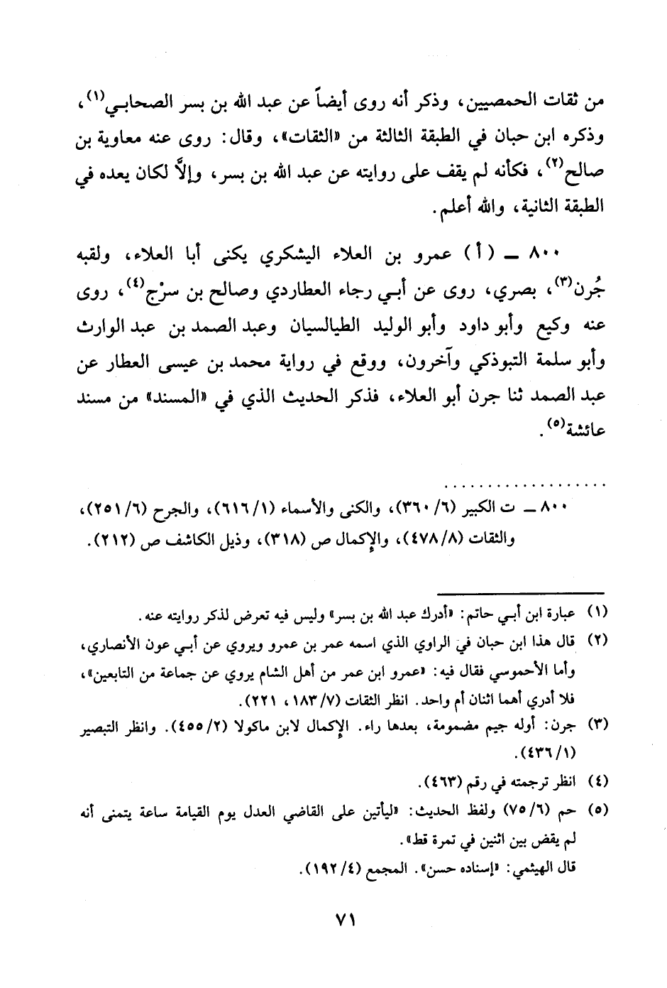 801 - اعَمْرو بن الْعَلَاء الْيَشْكُرِي يكنى أَبَا الْعَلَاء ولقبه جرن بَصرِي روى عَن أبي رَجَاء العطاردي وَصَالح بن سرج روى عَنهُ وَكِيع وَأَبُو دَاوُد وَأَبُو الْوَلِيد الطيالسيان وَعبد الصَّمد بن عبد الْوَارِث وَأَبُو سَلمَة التَّبُوذَكِي وَآخَرُونَ وَوَقع فِي رِوَايَة مُحَمَّد بن عِيسَى الْعَطَّار عَن عبد الصَّمد ثَنَا جرن أَبُو الْعَلَاء فَذكر الحَدِيث الَّذِي فِي الْمسند من مُسْند عَائِشَة رضى الله تَعَالَى عَنْهَا