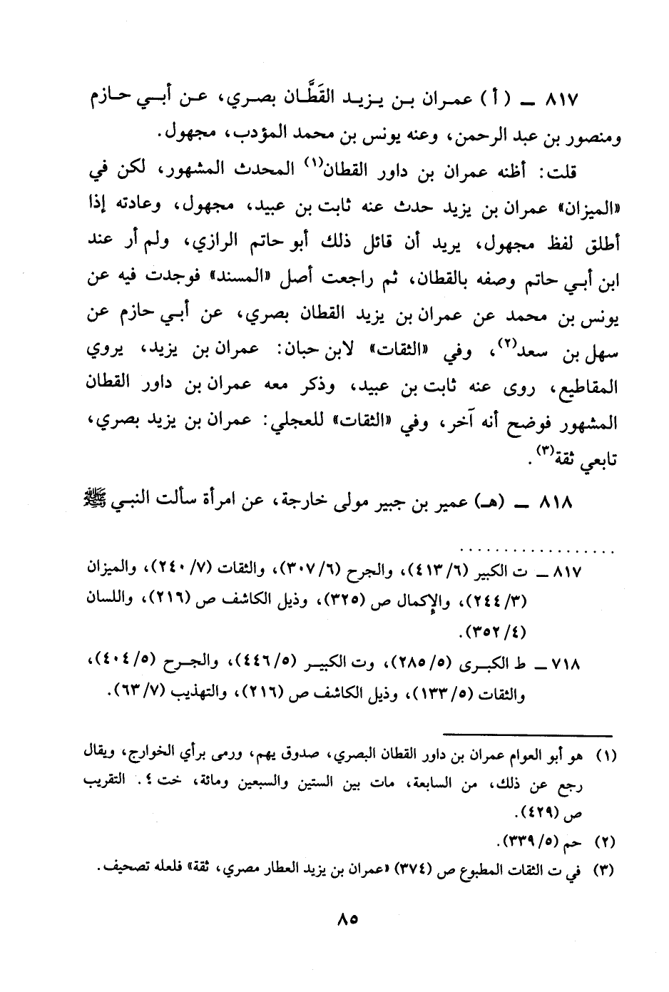 818 - اعمرَان بن يزِيد الْقطَّان بَصرِي عَن أبي حَازِم وَمَنْصُور بن عبد الرَّحْمَن وَعنهُ يُونُس بن مُحَمَّد الْمُؤَدب مَجْهُول قلت أَظُنهُ عمرَان بن دَاور الْقطَّان الْمُحدث الْمَشْهُور لَكِن فِي الْمِيزَان عمرَان بن يزِيد حدث عَنهُ ثَابت بن عبيد مَجْهُول وعادته إِذا أطلق لفظ مَجْهُول يُرِيد أَن قَائِل ذَلِك أَبُو حَاتِم الرَّازِيّ وَلم أر عِنْد بن أبي حَاتِم وَصفه بالقطان ثمَّ راجعت أصل الْمسند فَوجدت فِيهِ عَن يُونُس بن مُحَمَّد عَن عمرَان بن يزِيد الْقطَّان بَصرِي عَن أبي حَازِم عَن سهل بن سعد وَفِي الثِّقَات لِابْنِ حبَان عمرَان بن يزِيد يروي المقاطيع روى عَنهُ ثَابت بن عبيد وَذكر مَعَه عمرَان بن دَاور الْقطَّان الْمَشْهُور فوضح أَنه آخر وَفِي الثِّقَات للعجلي عمرَان بن يزِيد بَصرِي تَابِعِيّ ثِقَة