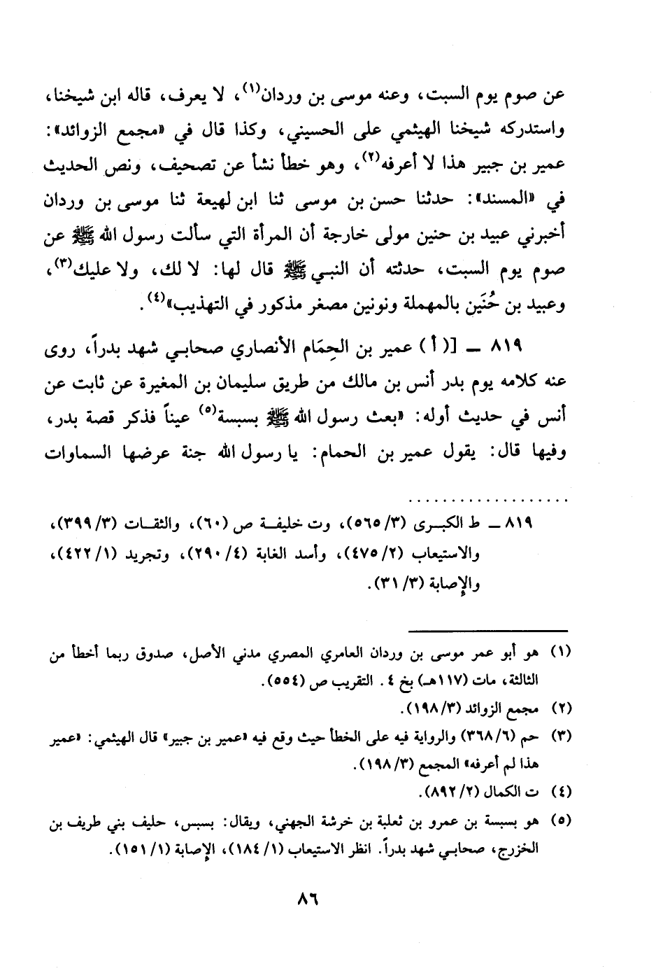 عَن صَوْم يَوْم السبت وَعنهُ مُوسَى بن وردان لَا يعرف قَالَه بن شَيخنَا واستدركه شَيخنَا الهيثمي على الْحُسَيْنِي وَكَذَا قَالَ فِي مجمع الزَّوَائِد عُمَيْر بن جُبَير هَذَا لَا أعرفهُ وَهُوَ خطأ نَشأ عَن تَصْحِيف وَنَصّ الحَدِيث فِي الْمسند حَدثنَا حسن بن مُوسَى ثَنَا بن لَهِيعَة ثَنَا مُوسَى بن وردان أَخْبرنِي عبيد بن حنين مولى خَارِجَة أَن الْمَرْأَة الَّتِي سَأَلت رَسُول الله صلى الله عَلَيْهِ وَسلم واله وَسلم عَن صَوْم يَوْم السبت حدثته أَن النَّبِي صلى الله عَلَيْهِ وَسلم قَالَ لَهَا لَا لَك وَلَا عَلَيْك وَعبيد بن حنين بِالْمُهْمَلَةِ ونونين مصغر مَذْكُور فِي التَّهْذِيب