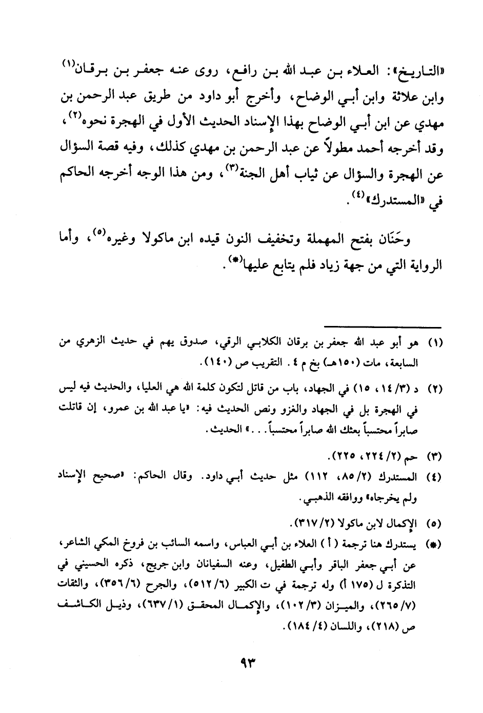 التَّارِيخ الْعَلَاء بن عبد الله بن رَافع روى عَنهُ جَعْفَر بن برْقَان وَابْن علاثة وَابْن أبي وضاح وَأخرج أَبُو دَاوُد من طَرِيق عبد الرَّحْمَن بن مهْدي عَن بن أبي وضاح بِهَذَا الْإِسْنَاد الحَدِيث الأول فِي الْهِجْرَة نَحوه وَقد أخرجه أَحْمد مطولا عَن عبد الرَّحْمَن بن مهْدي كَذَلِك وَفِيه قصَّة السُّؤَال عَن الْهِجْرَة وَالسُّؤَال عَن ثِيَاب أهل الْجنَّة وَمن هَذَا الْوَجْه أخرجه الْحَاكِم فِي الْمُسْتَدْرك وحنان بِفَتْح الْمُهْملَة وَتَخْفِيف النُّون قَيده بن مَاكُولَا وَغَيره وَأما الرِّوَايَة الَّتِي من جِهَة زِيَاد فَلم يُتَابع عَلَيْهَا