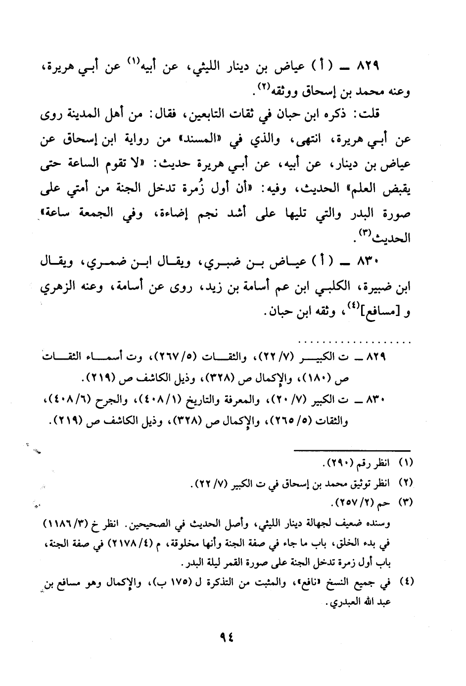 830 - اعِيَاض بن دِينَار اللَّيْثِيّ عَن أَبِيه عَن أبي هُرَيْرَة رضى الله تَعَالَى عَنهُ وَعنهُ مُحَمَّد بن إِسْحَاق وَوَثَّقَهُ قلت ذكره بن حبَان فِي ثِقَات التَّابِعين فَقَالَ من أهل الْمَدِينَة روى عَن أبي هُرَيْرَة رضى الله تَعَالَى عَنهُ انْتهى وَالَّذِي فِي الْمسند من رِوَايَة بن إِسْحَاق عَن عِيَاض بن دِينَار عَن أَبِيه عَن أبي هُرَيْرَة رضى الله تَعَالَى عَنهُ حَدِيث لَا تقوم السَّاعَة حَتَّى يقبض الْعلم الحَدِيث وَفِيه أَن أول زمرة تدخل الْجنَّة من أمتِي على صُورَة الْبَدْر وَالَّتِي تَلِيهَا على أَشد نجم أضاءه وَفِي الْجُمُعَة سَاعَة الحَدِيث
