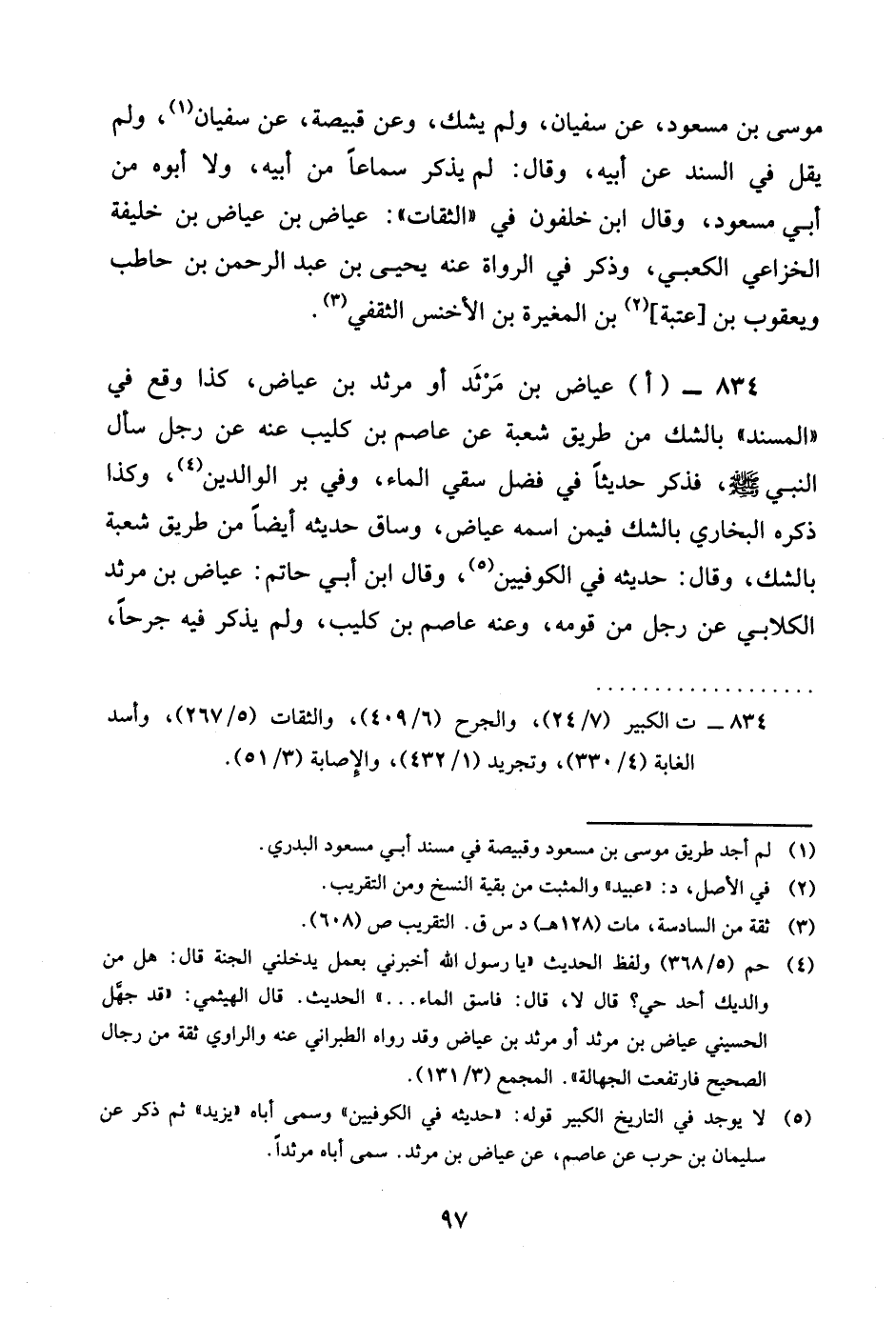 835 - اعِيَاض بن مرْثَد أَو مرْثَد بن عِيَاض كَذَا وَقع فِي الْمسند بِالشَّكِّ من طَرِيق شُعْبَة عَن عَاصِم بن كُلَيْب عَنهُ عَن رجل سَأَلَ النَّبِي صلى الله عَلَيْهِ وَسلم وَآله وَسلم فَذكر حَدِيثا فِي فضل سقِِي المَاء وَفِي بر الْوَالِدين وَكَذَا ذكره البُخَارِيّ بِالشَّكِّ فِيمَن اسْمه عِيَاض وسَاق حَدِيثه أَيْضا من طَرِيق شُعْبَة بِالشَّكِّ وَقَالَ حَدِيثه فِي الْكُوفِيّين وَقَالَ بن أبي حَاتِم عِيَاض بن مرْثَد الْكلابِي عَن رجل من قومه وَعنهُ عَاصِم بن كُلَيْب وَلم يذكر فِيهِ جرحا
