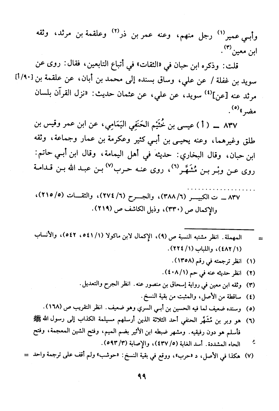 وَأبي عُمَيْر عَن رجل مِنْهُم وَعنهُ عمر بن ذَر وعلقمة بن مرْثَد وَثَّقَهُ بن معِين قلت وَذكره بن حبَان فِي الثِّقَات فِي اتِّبَاع التَّابِعين فَقَالَ روى عَن سُوَيْد بن غَفلَة عَن عَليّ وسَاق بِسَنَدِهِ الى مُحَمَّد بن أبان عَن عَلْقَمَة بن مرْثَد عَنهُ عَن سُوَيْد عَن عَليّ عَن عُثْمَان حَدِيث نزل الْقُرْآن بِلِسَان مُضر