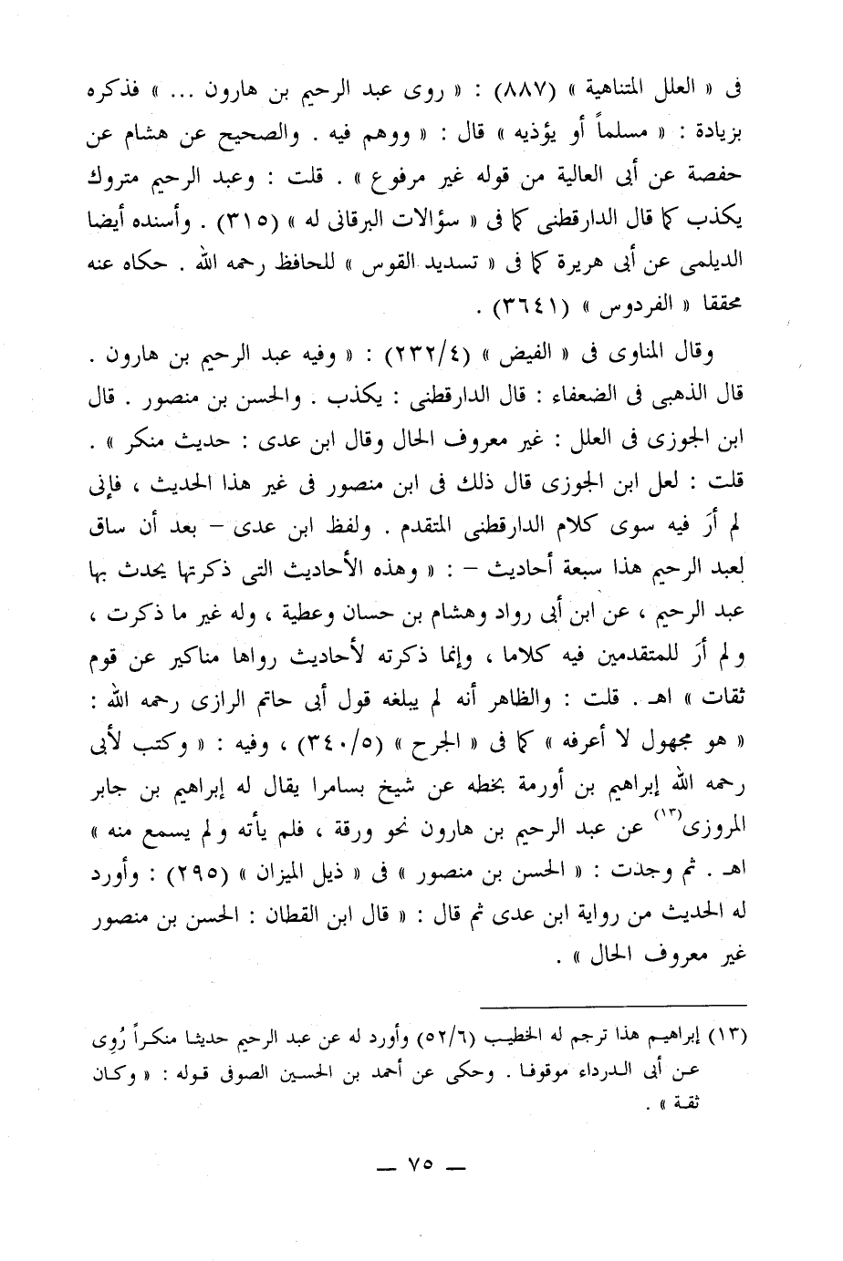 قال الذهبي في الضعفاء: قال الدارقطني: يكذب. والحسن بن منصور. قال ابن الجوزى في العلل: غير معروف الحال وقال ابن عدى: حديث منكر". قلت: لعل ابن الجوزى قال ذلك في ابن منصور في غير هذا الحديث، فإنى لم أرَ فيه سوى كلام الدارقطني المتقدم. ولفظ ابن عدى - بعد أن ساق لعبد الرحيم هذا سبعة أحاديث-: "وهذه الأحاديث التى ذكرتها يحدث بها عبد الرحيم، عن ابن أبي رواد وهشام بن حسان وعطية، وله غير ما ذكرت، ولم أرَ للمتقدمين فيه كلاما، وإنما ذكرته لأحاديث رواها مناكير عن قوم ثقات" اهـ. قلت: والظاهر أنه لم يبلغه قول أبي حاتم الرازى رحمه الله: "هو مجهول لا أعرفه" كما في "الجرح" (5/ 340)، وفيه: "وكتب لأبى رحمه الله إبراهيم بن أورمة بخطه عن شيخ بسامرا يقال له إبراهيم بن جابر المروزى (¬13) عن عبد الرحيم بن هارون نحو ورقة، فلم يأته ولم يسمع منه" اهـ. ثم وجدت: "الحسن بن منصور" في "ذيل الميزان" (295): وأورد له الحديث من رواية ابن عدى ثم قال: "قال ابن القطان: الحسن بن منصور غير معروف الحال".