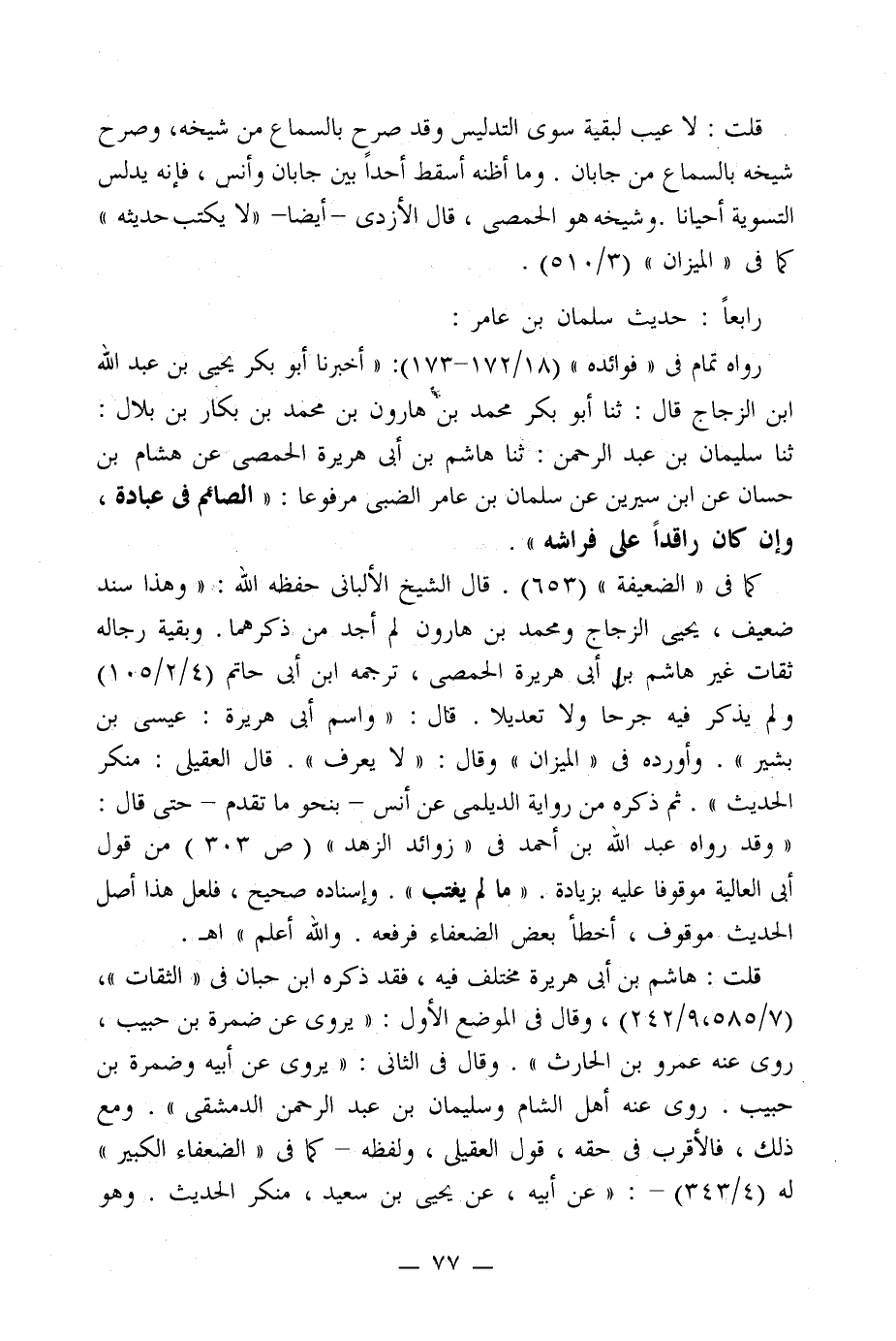 كما في "الضعيفة" (653). قال الشيخ الألمانى حفظه الله: "وهذا سند ضعيف، يحيى الزجاج ومحمد بن هارون لم أجد من ذكرهما. وبقية رجاله ثقات غير هاشم بن أبي هريرة الحمصى، ترحمه ابن أبي حاتم (4/ 2/ 105) ولم يذكر فيه جرحا ولا تعديلا. قال: "واسم أبي هريرة: عيسى بن بشير". وأورده في "الميزان" وقال: "لا يعرف". قال العقيلى: منكر الحديث". ثم ذكره من رواية الديلمى عن أنس -بنحو ما تقدم- حتى قال: "وقد رواه عبد الله بن أحمد في "زوائد الزهد" (ص 303) من قول أبي العالية موقوفا عليه بزيادة. "ما لم يغتب". وإسناده صحيح، فلعل هذا أصل الحديث موقوف، أخطأ بعض الضعفاء فرفعه. والله أعلم" اهـ.