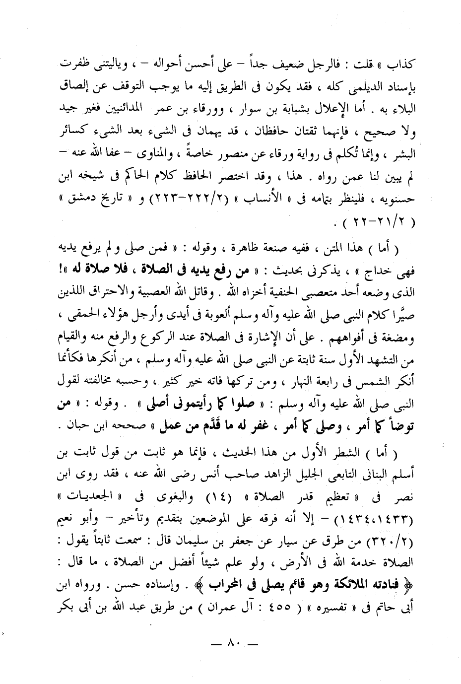 (أما) هذا المتن، ففيه صنعة ظاهرة، وقوله: "فمن صلى ولم يرفع يديه فهى خداج"، يذكرنى بحديث: "من رفع يديه في الصلاة، فلا صلاة له"! الذى وضعه أحد متعصبى الحنفية أخزاه الله. وقاتل الله العصبية والاحتراق اللذين صيَّرا كلام النبي صلى الله عليه وآله وسلم ألعوبة في أيدى وأرجل هؤلاء الحمقى، ومضغة في أفواههم. على أن الإِشارة في الصلاة عند الركوع والرفع منه والقيام من التشهد الأول سنة ثابتة عن النبي صلى الله عليه وآله وسلم، من أنكرها فكأنما أنكر الشمس في رابعة النهار، ومن تركها فاته خير كثير، وحسبه مخالفته لقول النبي صلى الله عليه وآله وسلم: "صلوا كما رأيتمونى أصلى". وقوله: "من توضأ كما أمر، وصلى كما أمر، غفر له ما قدَّم من عمل" صححه ابن حبان.