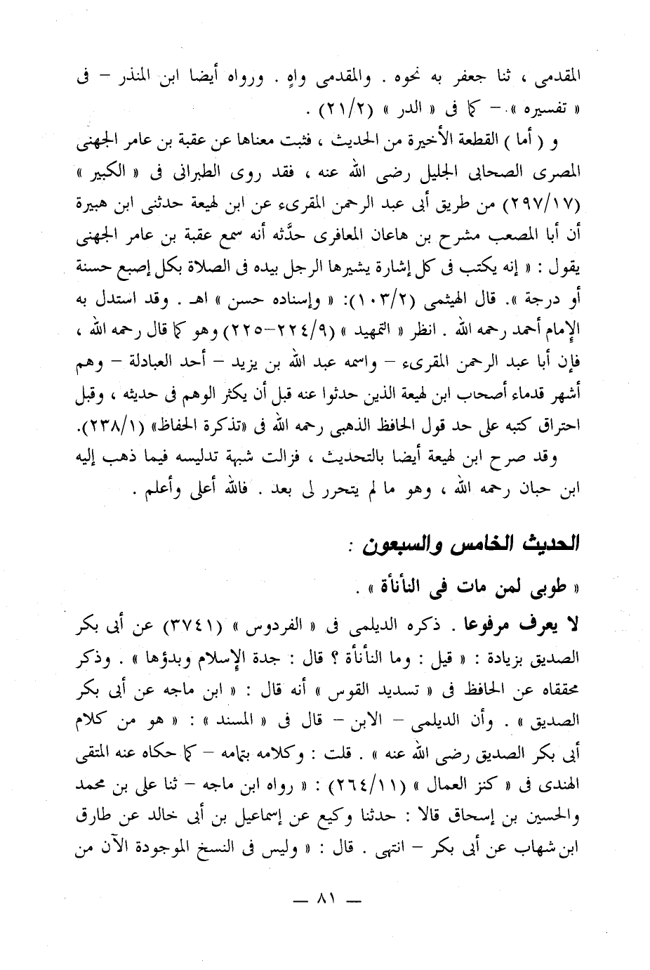 و(أما) القطعة الأخيرة من الحديث، فثبت معناها عن عقبة بن عامر الجهنى المصرى الصحابى الجليل رضى الله عنه، فقد روى الطبراني في "الكبير" (17/ 297) من طريق أبي عبد الرحمن المقرئ عن ابن لهيعة حدثنى ابن هبيرة أن أبا المصعب مشرح بن هاعان المعافرى حدَّثه أنه سمع عقبة بن عامر الجهنى يقول: "إنه يكتب في كل إشارة يشيرها الرجل بيده في الصلاة بكل إصبع حسنة أو درجة". قال الهيثمى (2/ 103): "وإسناده حسن" اهـ. وقد استدل به الإِمام أحمد رحمه الله. انظر "التمهيد" (9/ 224 - 225) وهو كما قال رحمه الله، فإن أبا عبد الرحمن المقرئ -واسمه عبد الله بن يزيد - أحد العبادلة - وهم أشهر قدماء أصحاب ابن لهيعة الذين حدثوا عنه قبل أن يكثر الوهم في حديثه، وقبل احتراق كتبه على حد قول الحافظ الذهبى رحمه الله في "تذكرة الحفاظ" (1/ 238). وقد صرح ابن لهيعة أيضًا بالتحديث، فزالت شبهة تدليسه فيما ذهب إليه ابن حبان رحمه الله، وهو ما لم يتحرر لى بعد. فالله أعلى وأعلم.