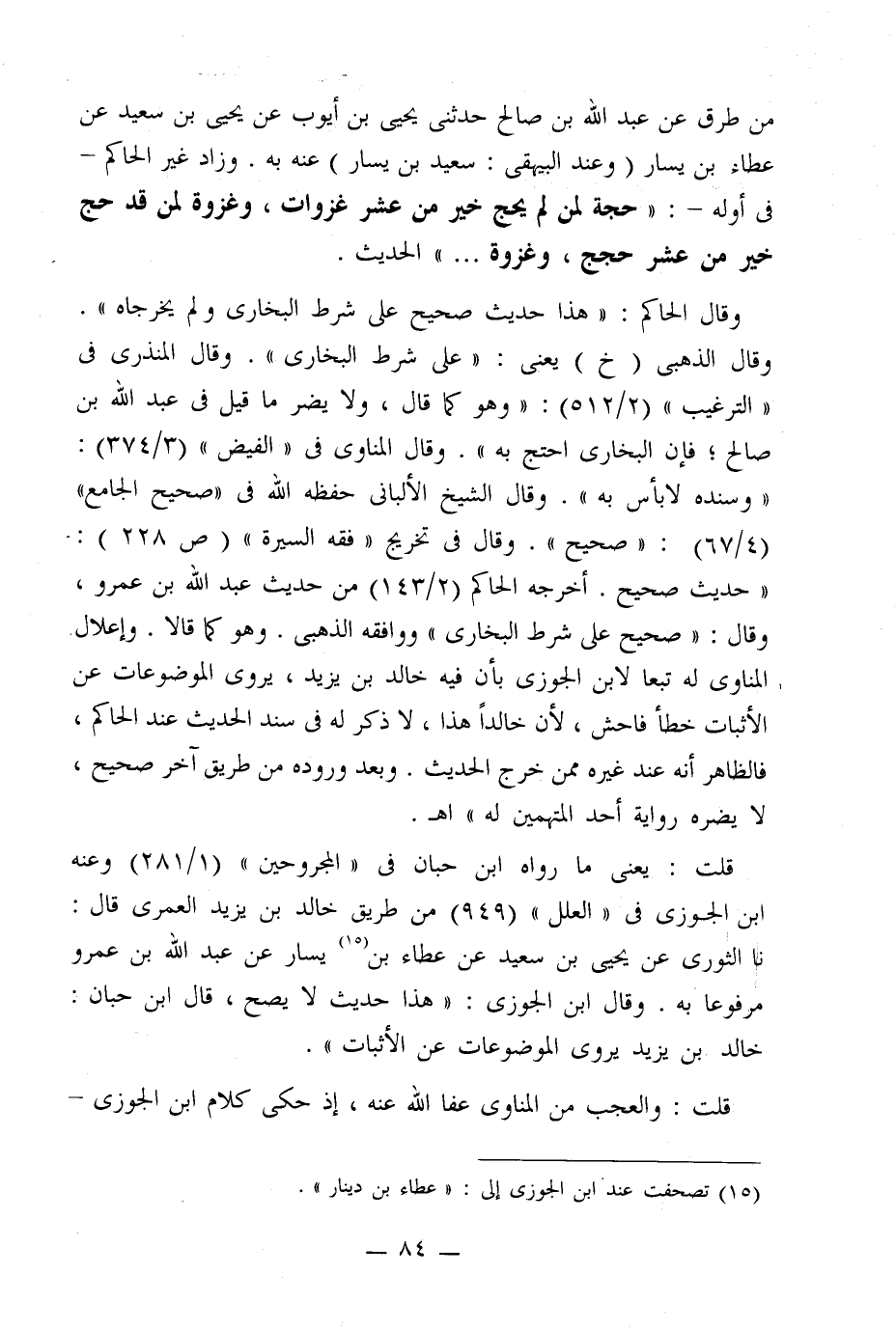 وقال الحاكم: "هذا حديث صحيح على شرط البخارى ولم يخرجاه". وقال الذهبي (خ) يعنى: "على شرط البخارى". وقال المنذرى في "الترغيب" (2/ 512): "وهو كما قال، ولا يضر ما قيل في عبد الله بن صالح؛ فإن البخارى احتج به". وقال المناوى في "الفيض" (3/ 374): "وسنده لا بأس به". وقال الشيخ الألباني حفظه الله في "صحيح الجامع" (4/ 67): "صحيح". وقال في تخريج "فقه السيرة" (ص 228): "حديث صحيح. أخرجه الحاكم (2/ 143) من حديث عبد الله بن عمرو، وقال: "صحيح على شرط البخاري" ووافقه الذهبي. وهو كما قالا. وإعلال المناوى له تبعًا لابن الجوزى بأن فيه خالد بن يزيد، يروى الموضوعات عن الأثبات خطأ فاحش، لأن خالدًا هذا، لا ذكر له في سند الحديث عند الحاكم، فالظاهر أنه عند غيره ممن خرج الحديث. وبعد وروده من طريق آخر صحيح، لا يضره رواية أحد المتهمين له" اهـ.