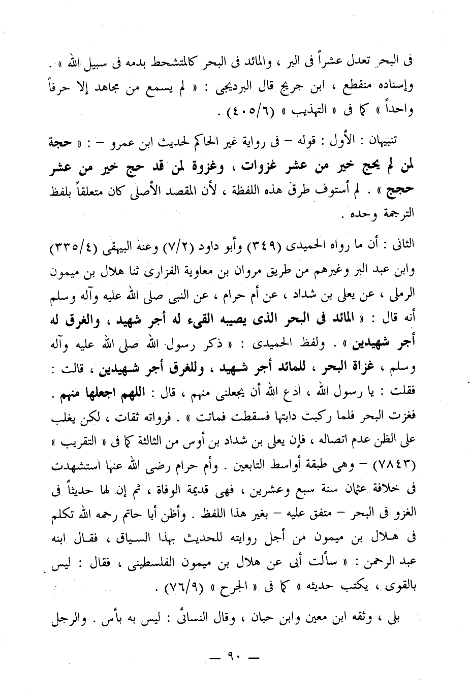 الثانى: أن ما رواه الحميدى (349) وأبو داود (2/ 7) وعنه البيهقي (4/ 335) وابن عبد البر وغيرهم من طريق مروان بن معاوية الفزارى ثنا هلال بن ميمون الرملى، عن يعلى بن شداد، عن أم حرام، عن النبي صلى الله عليه وآله وسلم أنه قال: "المائد في البحر الذى يصيبه القئ له أجر شهيد، والغرق له أجر شهيدين". ولفظ الحميدى: "ذكر رسول الله صلى الله عليه وآله وسلم، غزاة البحر، للمائد أجر شهيد، وللغرق أجر شهيدين، قالت: فقلت: يا رسول الله، ادع الله أن يجعلنى منهم، قال: اللهم اجعلها منهم. فغزت البحر فلما ركبت دابتها فسقطت فماتت". فرواته ثقات، لكن يغلب على الظن عدم اتصاله، فإن يعلى بن شداد بن أوس من الثالثة كما في "التقريب" (7843) - وهى طبقة أواسط التابعين. وأم حرام رضى الله عنها استشهدت في خلافة عثمان سنة سبع وعشرين، فهى قديمة الوفاة، ثم إن لها حديثًا في الغزو في البحر- متفق عليه- بغير هذا اللفظ. وأظن أبا حاتم رحمه الله تكلم في هلال بن ميمون من أجل روايته للحديث بهذا السياق، فقال ابنه عبد الرحمن: "سألت أبي عن هلال بن ميمون الفلسطيني، فقال: ليس بالقوى، يكتب حديثه" كما في "الجرح" (9/ 76).