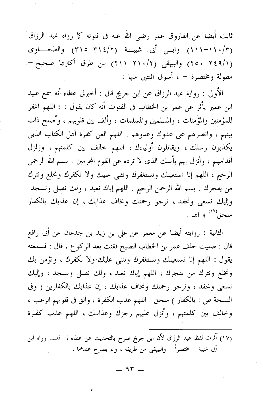 الأولى: رواية عبد الرزاق عن ابن جريج قال: أخبرني عطاء أنه سمع عبيد ابن عمير يأثر عن عمر بن الخطاب في القنوت أنه كان يقول: "اللهم اغفر للمؤمنين والمؤمنات، والمسلمين والمسلمات، وألف بين قلوبهم، وأصلح ذات بينهم، وانصرهم على عدوك وعدوهم. اللهم العن كفرة أهل الكتاب الذين يكذبون رسلك، ويقاتلون أولياءك، اللهم خالف بين كلمتهم، وزلزل أقدامهم، وأنزل بهم بأسك الذى لا ترده عن القوم المجرمين. بسم الله الرحمن الرحيم، اللهم إنا نستعينك ونستغفرك ونثنى عليك ولا نكفرك ونخلع ونترك من يفجرك. بسم الله الرحمن الرحيم. اللهم إياك نعبد، ولك نصلى ونسجد وإليك نسعى ونحفد، نرجو رحمتك ونخاف عذابك، إن عذابك بالكفار ملحق (¬17) " اهـ.