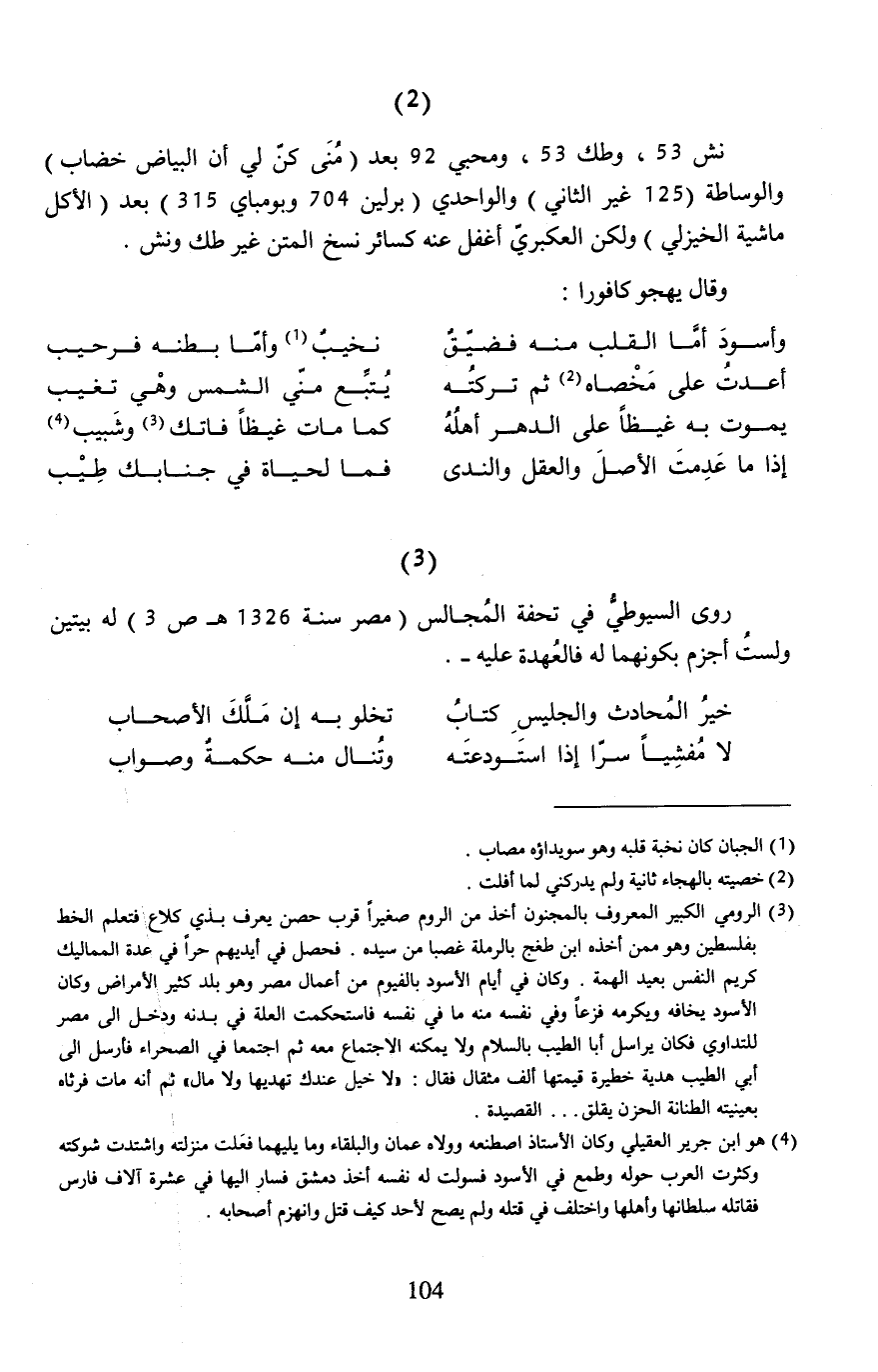(¬3) الرومي الكبير المعروف بالمجنون أخذ من الروم صغيرًا قرب حصن يعرف بذي كلاع فتعلم الخط بفلسطين وهو ممن أخذه ابن طغج بالرملة غصبا من سيده. فحصل في أيديهم حرًّا في عدة المماليك كريم النفس بعيد الهمة. وكان في أيام الأسود بالفيوم من أعمال مصر وهو بلد كثير الأمراض وكان الأسود يخافه ويكرمه فزعًا وفي نفسه منه ما في نفسه فاستحكمت العلة في بدنه ودخل إلى مصر للتداوي فكان يراسل أَبا الطِّيب بالسلام ولا يمكنه الاجتماع معه ثم اجتمعا في الصحراء فأرسل إلى أبي الطِّيب هدية خطيرة قيمتها أَلْف مثقال فقال: "لا خيل عندك تهديها ولا مال" ثم أنَّه مات فرثاه بعينيته الطنانة الحزن يقلق ... القصيدة.