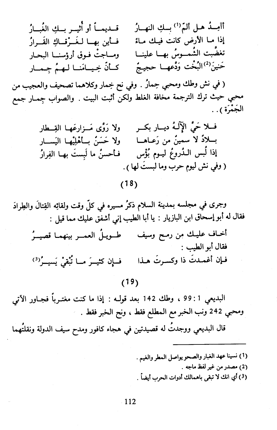 وجرى في مجلسه بمدينة السلام ذكرُ مسيره في كلّ وقت ولقائِه القِتال والطِرادَ فقال له أبو إسحاق ابن البازيار: يا أبا الطيب إني أشفق عليك مما قيل: