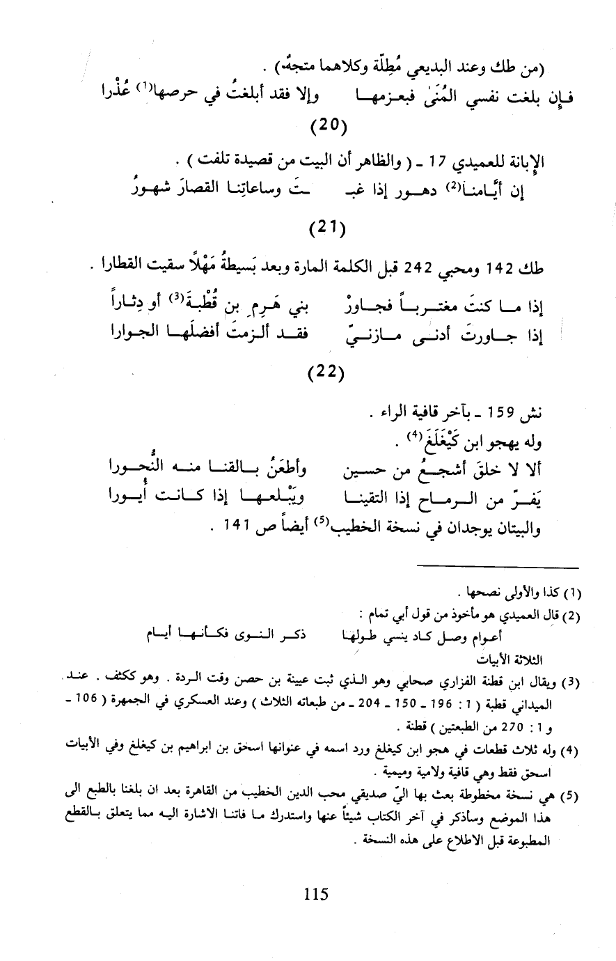 (¬5) هي نسخة مخطوطة بعث بها إليّ صديقي محب الدين الخطيب من القاهرة بعد أن بلغنا بالطبع إلى هذا الموضع وسأذكر في آخر الكتاب شيئًا عنها واستدرك ما فاتنا الإشارة إليه مما يتعلق بالقطع المطبوعة قبل الاطلاع على هذه النسخة.