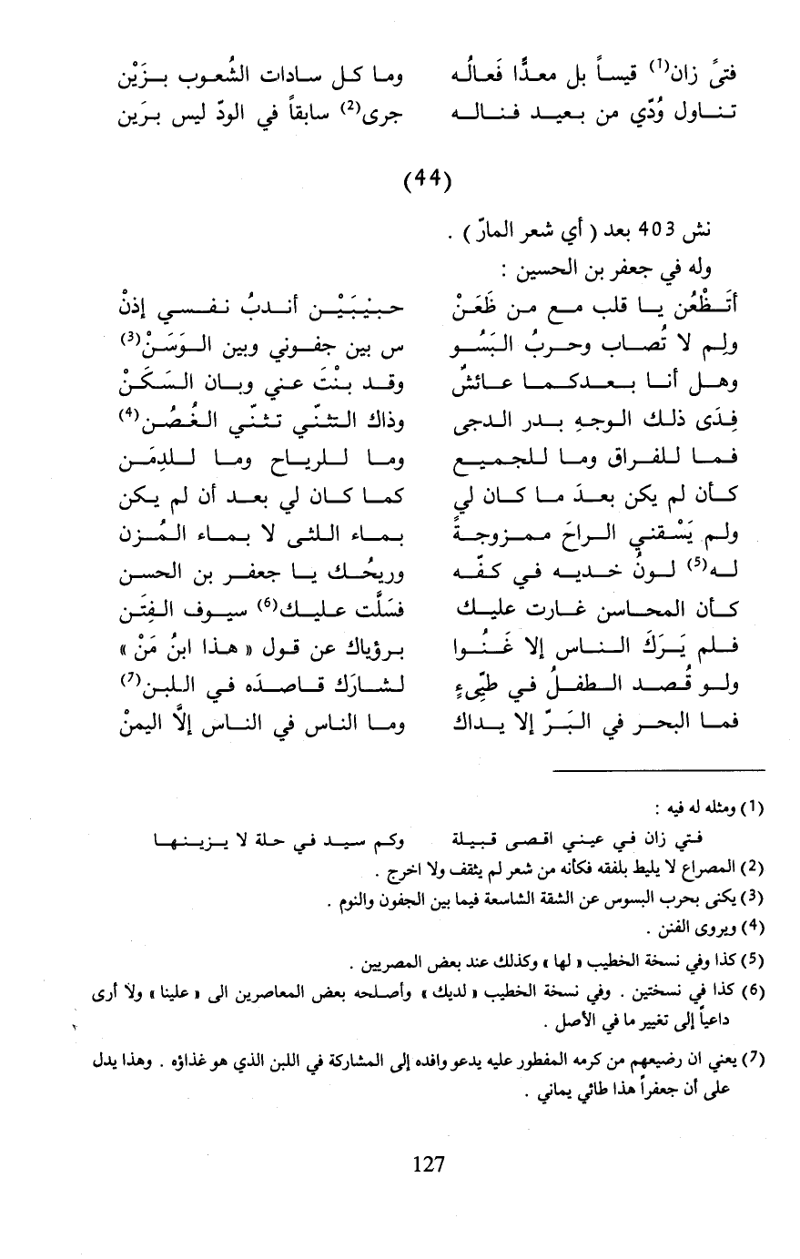 (¬7) يعني أن رضيعهم من كرمه المفطور عليه يدعو وافده إلى المشاركة في اللبن الذي هو غذاؤه. وهذا يدل على أن جعفرًا هذا طائي يماني.