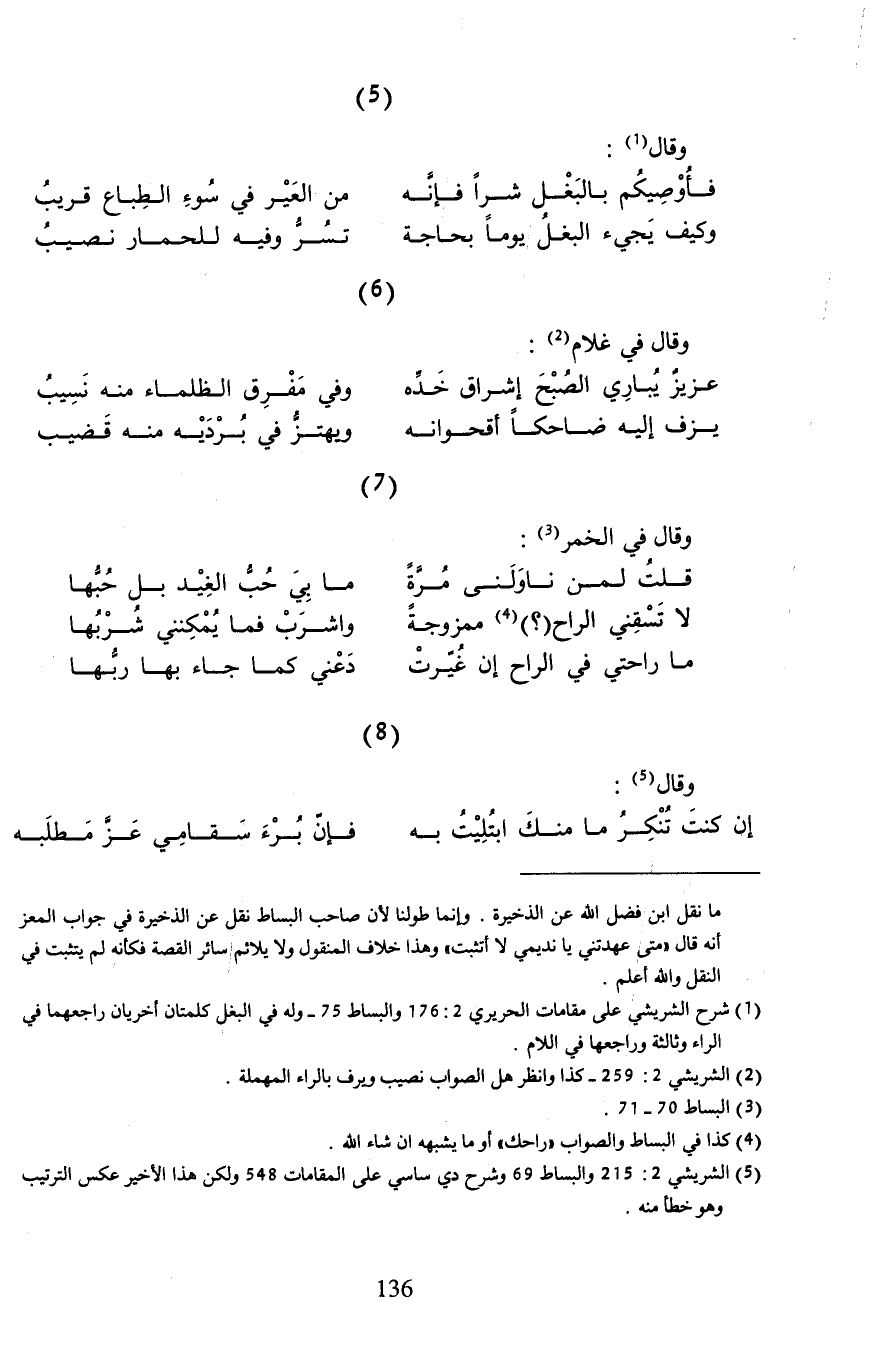 (¬5) الشريشي 2: 215 والبساط 69 وشرح دي ساسي على المقامات 548 ولكن هذا الأخير عكس الترتيب وهو خطأ منه.