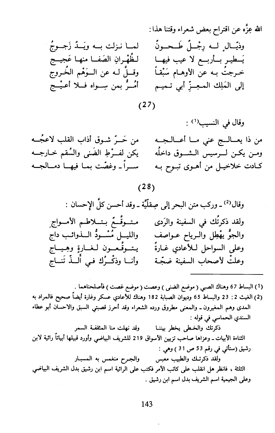 الثناءة الأبيات - وعزاها صاحب تزيين الأسواق 219 للشريف البياضي وأورد قبيلها أبياتًا رائية لابن رشيق (ستأتي في رقم 53 ص 31) وهي: