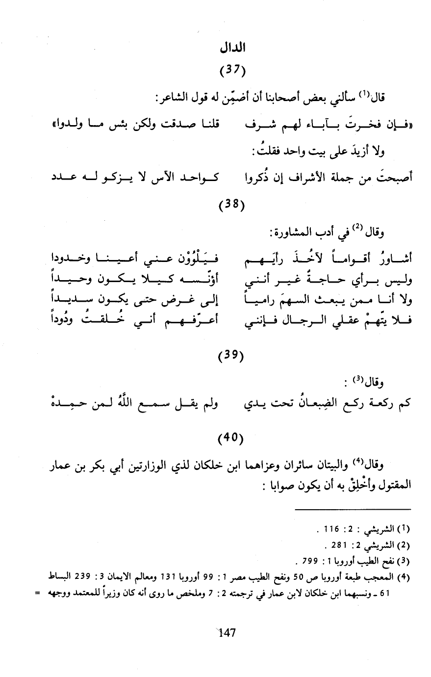 (¬4) المعجب طبعة أوروبا ص 50 ونفح الطيب مصر 1: 99 أوروبا 131 ومعالم الإيمان 3: 239 البساط 61 - ونسبهما ابن خلكان لابن عمار في ترجمته 2: 7 وملخص ما روى أنه كان وزيرًا للمعتمد ووجهه =