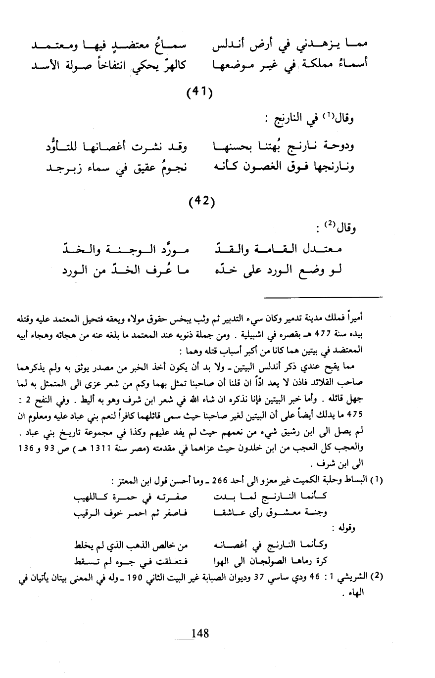 مما يقبح عندي ذكر أندلس البيتين - ولا بد أن يكون أخذ الخبر من مصدر يوثق به ولم يذكرهما صاحب القلائد فإذن لا يعد إذًا أن قلنا أن صاحبنا تمثل بهما وكم من شعر عزى التي المتمثل به لما جهل قائله. وأما خبر البيتين فإنا نذكره أن شاء الله في شعر ابن شرف وهو به أليط. وفي النفح 2: 475 ما يدلك أيضًا على أن البيتين لغير صاحبنا حيث سمى قائلهما كافرًا لنعم بني عباد عليه ومعلوم أن لم يصل إلى ابن رشيق شيء من نعمهم حيث لم يفد عليهم وكذا في مجموعة تاريخ بني عباد. والعجب كل العجب من ابن خلدون حيث عزاهما في مقدمته (مصر سنة 1311 هـ) ص 3 و 136 إلى ابن شرف.