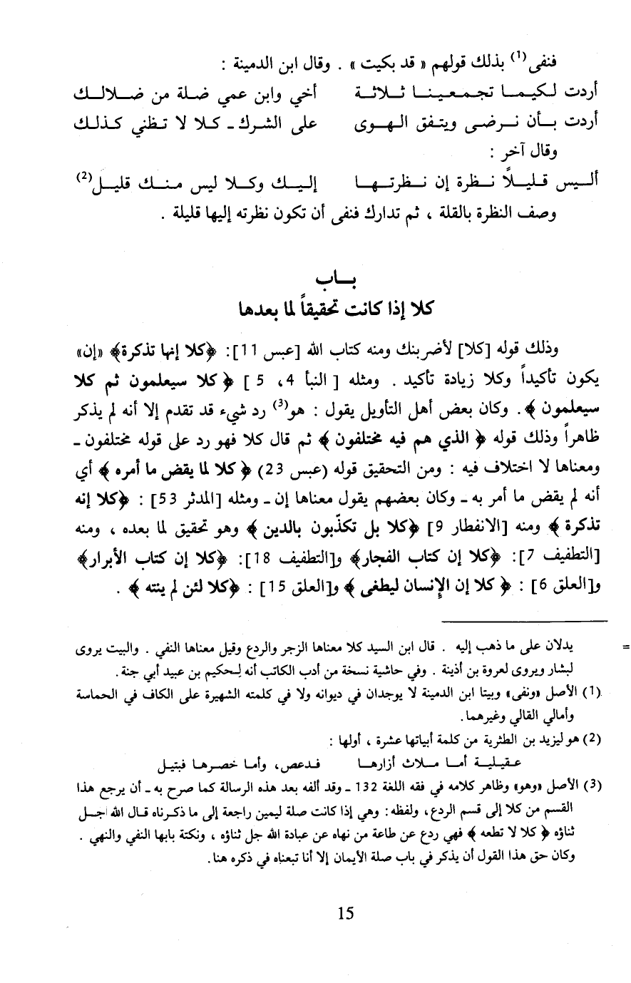 (¬3) الأصل "وهو" وظاهر كلامه في فقه اللغة 132 - وقد ألفه بعد هذه الرسالة كما صرح به- أن يرجع هذا القسم من كلا إلى قسم الردع، ولفظه: وهي إذا كانت صلة ليمين راجعة إلى ما ذكرناه قال الله جل ثناؤه {كَلَّا لَا تُطِعْهُ} فهي ردع عن طاعة من نهاه عن عبادة الله جل ثناؤه، ونكتة بابها النفي والنهي. وكان حق هذا القول أن يذكر في باب صلة الأيمان إلا أنا تبعناه في ذكره هنا.