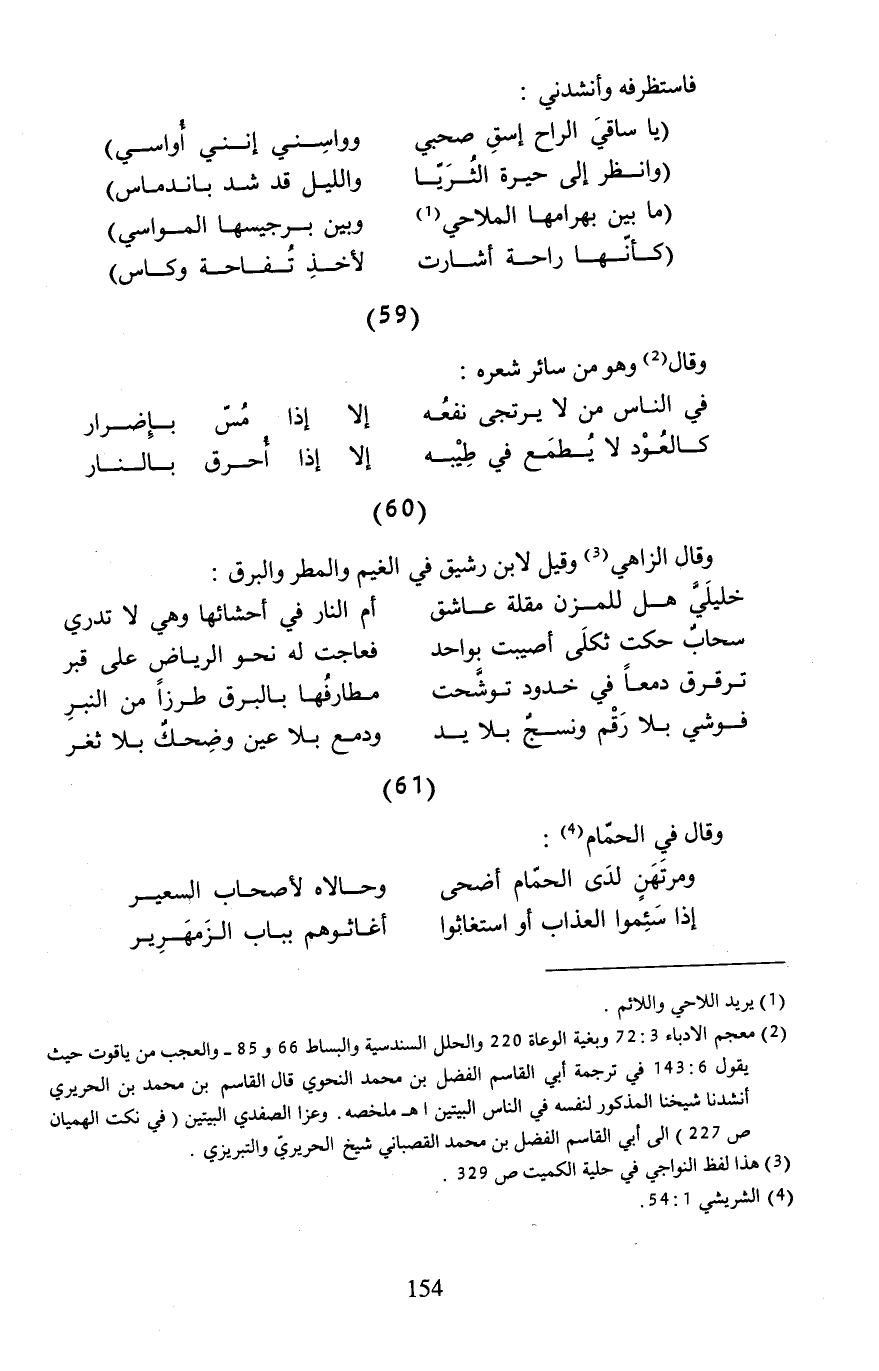 (¬2) معجم الأدباء 3: 72 وبغية الوعاة 220 والحلل السندسية والبساط 66 و 85 - والعجب من ياقوت حيث يقول 6: 143 في ترجمة أبي القاسم الفضل بن محمد النحوي قال القاسم بن محمد بن الحريري أنشدنا شيخنا المذكور لنفسه في الناس البيتين اهـ ملخصه. وعزا الصفدي البيتين (في نكت الهميان ص 227) إلى أبي القاسم الفضل بن محمد القصباني شيخ الحريريّ والتبريزي.