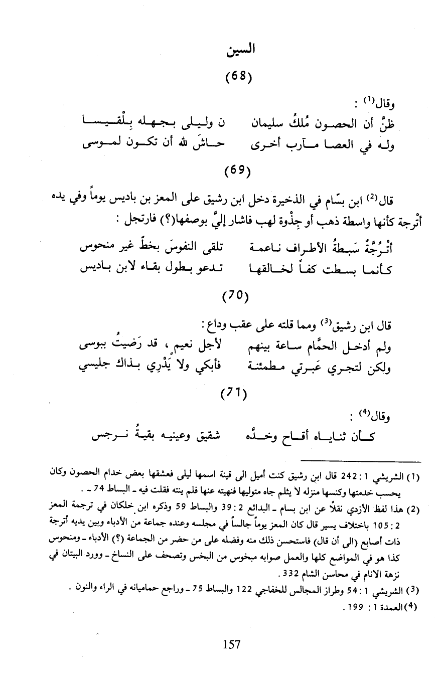 (¬1) الشريشي 1: 242 قال ابن رشيق كنت أميل إلى قينة اسمها ليلى فعشقها بعض خدام الحصون وكان يحسب خدمتها وكنسها منزله لا يثلم جاه متوليها فنهيته عنها فلم ينته فقلت فيه- البساط 74 - .