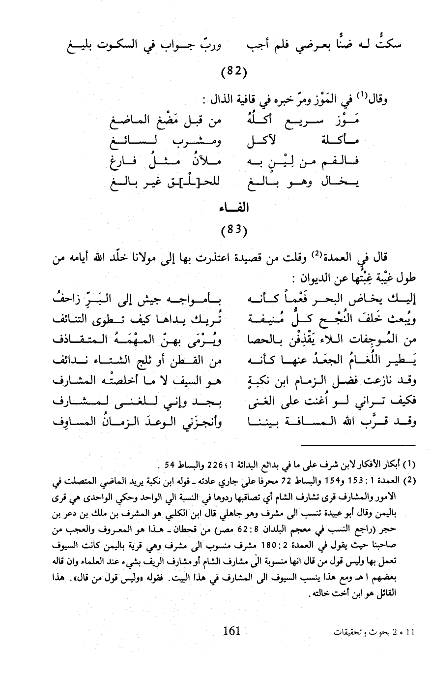 (¬2) العمدة 1: 153 و 154 والبساط 72 محرفا على جاري عادته- قوله ابن نكبة يريد الماضي المتصلت في الأمور والمشارف قرى تشارف الشام أي تصاقبها ردوها في النسبة الي الواحد وحكي الواحدي هي قرى باليمن وقال أبو عبيدة تنسب إلى مشرف وهو جاهلي قال ابن الكلبي هو المشرف بن ملك بن دعر بن حجر (راجع النسب في معجم البلدان 8: 62 مصر) من قحطان- هذا هو المعروف والعجب من صاحبنا حيث يقول في العمدة 180: 2 مشرف منسوب إلى مشرف وهي قرية باليمن كانت السيوف تعمل بها وليس قول من قال أنها منسوبة إلى مشارف الشام أو مشارف الريف بشيء عند العلماء وإن قاله بعضهم اهـ ومع هذا ينسب السيوف إلى المشارف في هذا البيت. فقوله "وليس قول من قال". هذا القائل هو ابن أخت خالته.