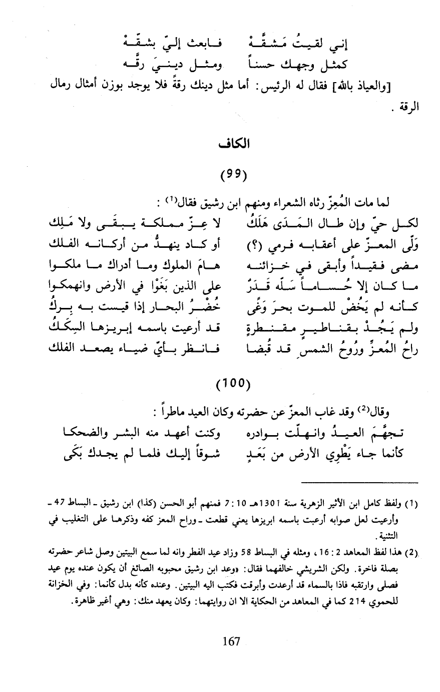 (¬2) هذا لفظ المعاهد 2: 16، ومثله في البساط 58 وزاد عيد الفطر وإنه لما سمع البيتين وصل شاعر حضرته بصلة فاخرة. ولكن الشريشي خالفهما فقال: "وعد ابن رشيق محبويه الصائغ أن يكون عنده يوم عيد فصلى وارتقبه فإذا بالسماء قد أرعدت وأبرقت فكتب إليه البيتين. وعنده كأنه بدل كأنما: وفي الخزانة للحموي 214 كما في المعاهد من الحكاية إلا أن روايتهما: وكان يعهد منك: وهي أغير ظاهرة.