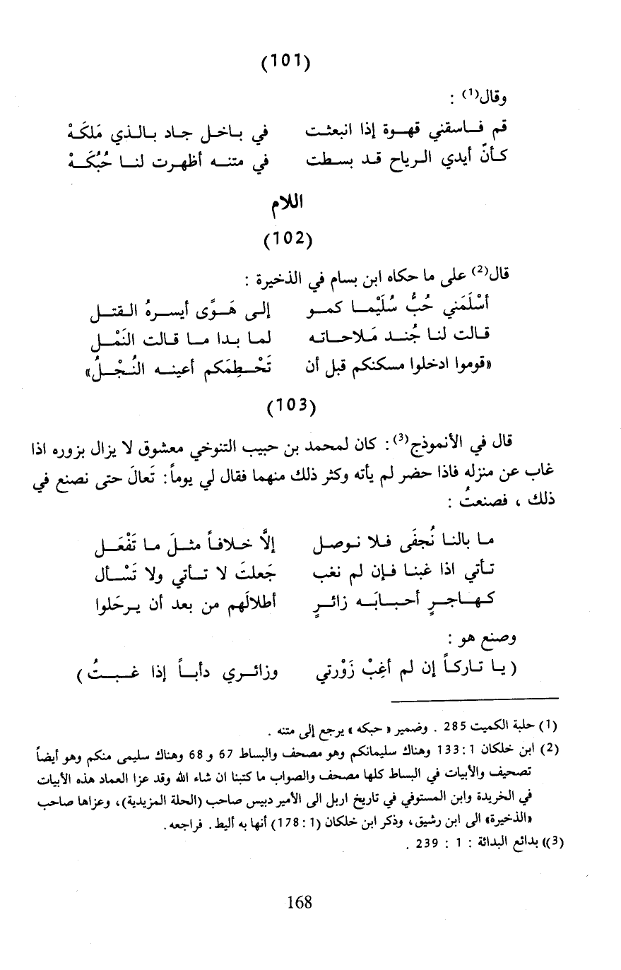 (¬2) ابن خلكان 1: 133 وهناك سليمانكم وهو مصحف والبساط 67 و 68 وهناك سليمى منكم وهو أيضًا تصحيف والأبيات في البساط كلها مصحف والصواب ما كتبنا إن شاء الله وقد عزا العماد هذه الأبيات في الخريدة وابن المستوفي في تاريخ إربل إلى الأمير دبيس صاحب (الحلة المزيدية)، وعزاها صاحب "الذخيرة" إلى ابن رشيق، وذكر ابن خلكان (1: 178) أنها به أليط. فراجعه.