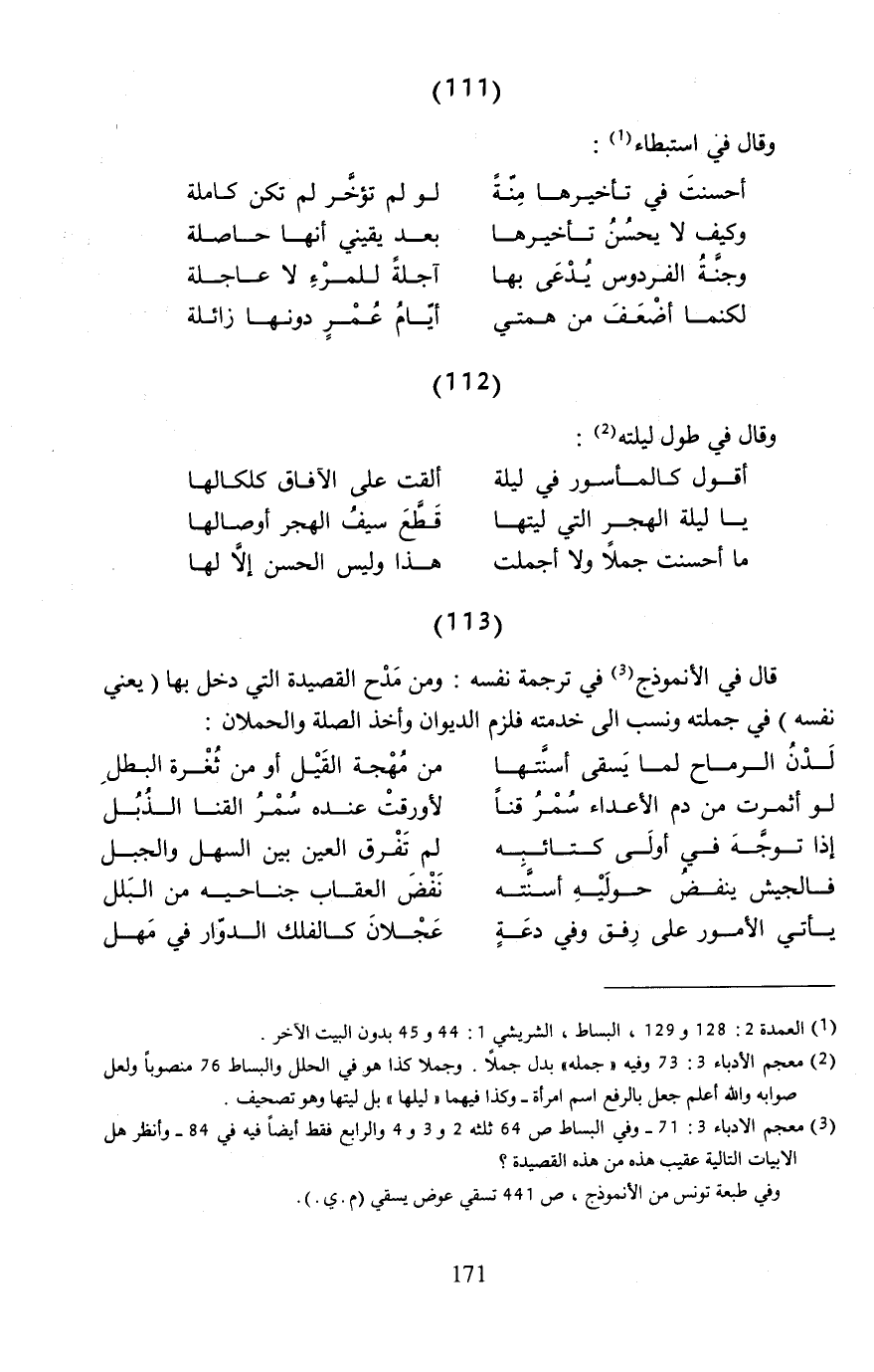 (¬3) معجم الأدباء 3: 71 - وفي البساط ص 64 ثلثه 2 و 3 و 4 والرابع فقط أيضًا فيه في 84 - وانظر هل الأبيات التالية عقيب هذه من هذه القصيدة؟