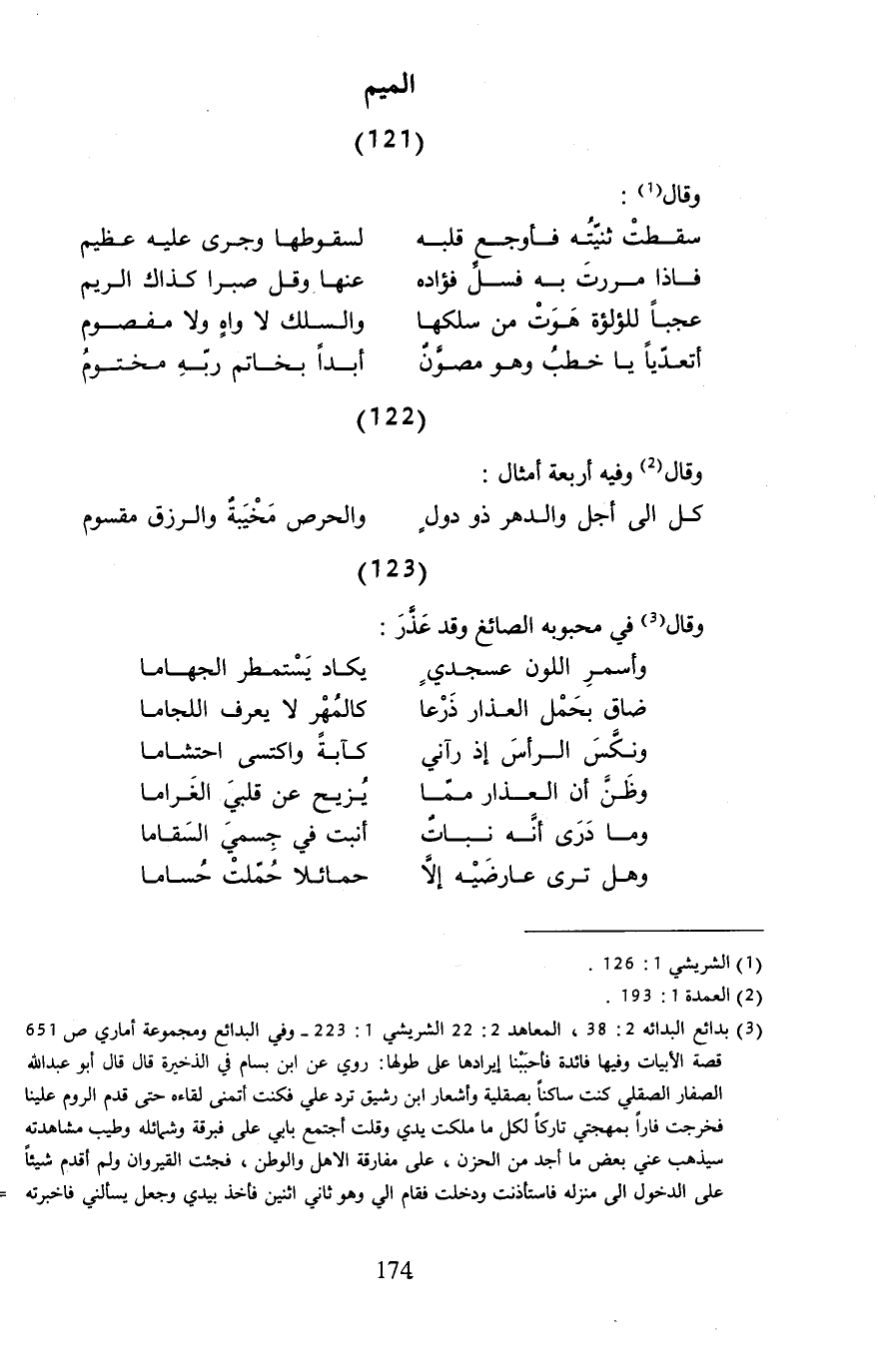 (¬3) بدائع البدائه 2: 38، المعاهد 2: 22 الشريشي 1: 223 - وفي البدائع ومجموعة أماري ص 651 قصة الأبيات وفيها فائدة فأحبَبْنا إيرادها على طولها: روي عن ابن بسام في الذخيرة قال قال أبو عبد الله الصفار الصقلي كنت ساكنًا بصقلية وأشعار ابن رشيق ترد علي فكنت أتمنى لقاءه حتى قدم الروم علينا فخرجت فارًا بمهجتي تاركًا لكل ما ملكت يدي وقلت أجتمع بأبي على فبرقة وشمائله وطيب مشاهدته سيذهب عني بعض ما أجد من الحزن، على مفارقة الأهل والوطن، فجئت القيروان ولم أقدم شيئًا على الدخول إلى منزله فاستأذنت ودخلت فقام الي وهو ثاني اثنين فأخذ بيدي وجعل يسألني فأخبرته =