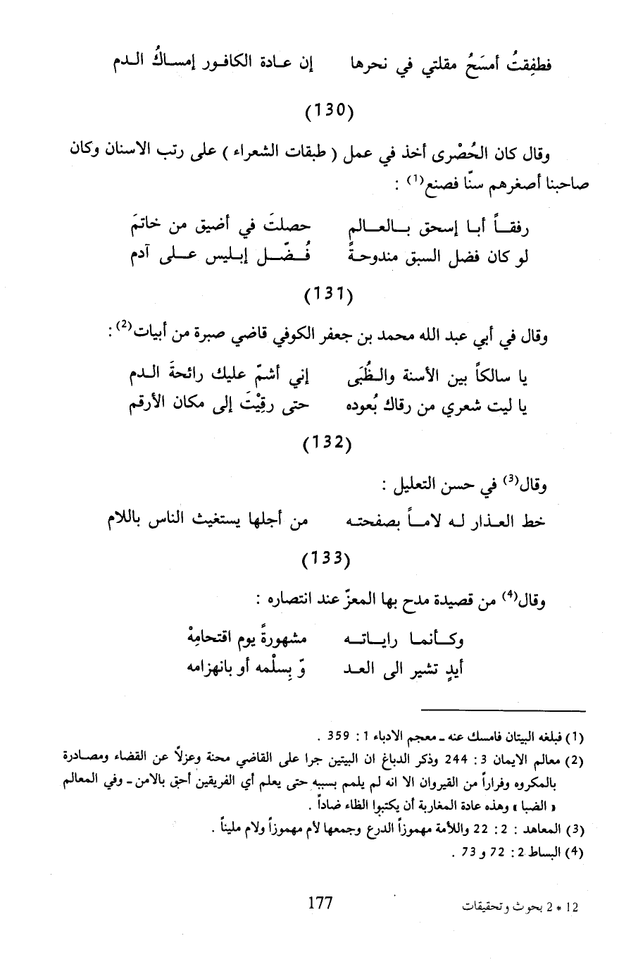(¬2) معالم الإيمان 3: 244 وذكر الدباغ أن البيتين جرا على القاضي محنة وعزلًا عن القضاء ومصادرة بالمكروه وفرارًا من القيروان إلا أنه لم يلمم بسببه حتى يعلم أي الفريقين أحق بالأمن -وفي المعالم "الضبا" وهذه عادة المغاربة أن يكتبوا الظاء ضادًا.