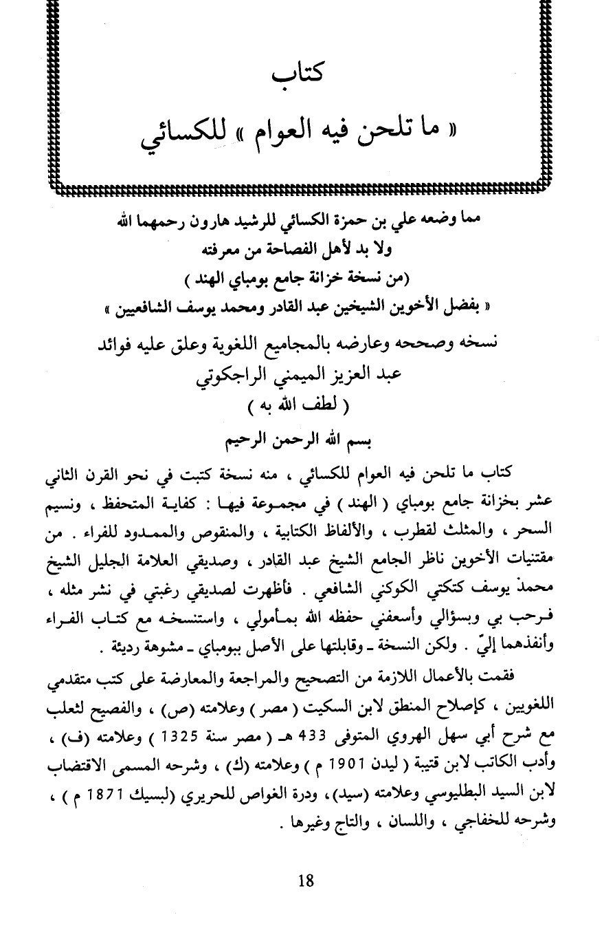 كتاب ما تلحن فيه العوام للكسائي، منه نسخة كتبت في نحو القرن الثاني عشر بخزانة جامع بومباي (الهند) في مجموعة فيها: كفاية المتحفظ، ونسيم السحر، والمثلث لقطرب، والألفاظ الكتابية، والمنقوص والممدود للفراء. من مقتنيات الأخوين ناظر الجامع الشيخ عبد القادر، وصديقي العلامة الجليل الشيخ محمد يوسف كتكتي الكوكني الشافعي. فاظهرت لصديقي رغبتي في نشر مثله، فرحب بي وبسؤالي وأسعفني حفظه الله بمأمولي، واستنسخه مع كتاب الفراء وأنفذهما إليّ. ولكن النسخة -وقابلتها على الأصل ببومباي- مشوهة رديئة.