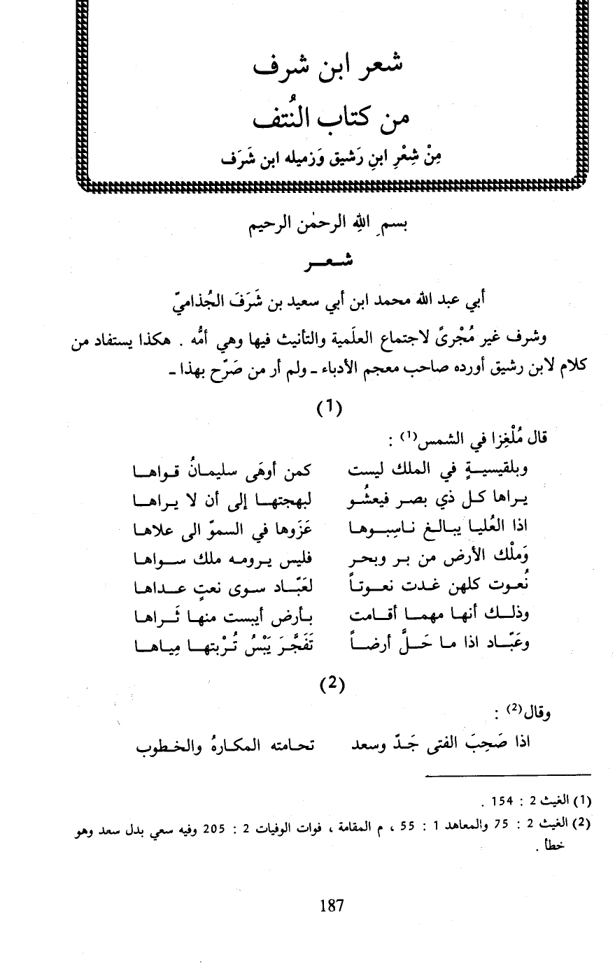 شعر ابن شرف من كتاب النُتف مِنْ شِعْرِ ابنِ رَشيق وَزميله ابن شَرَف
