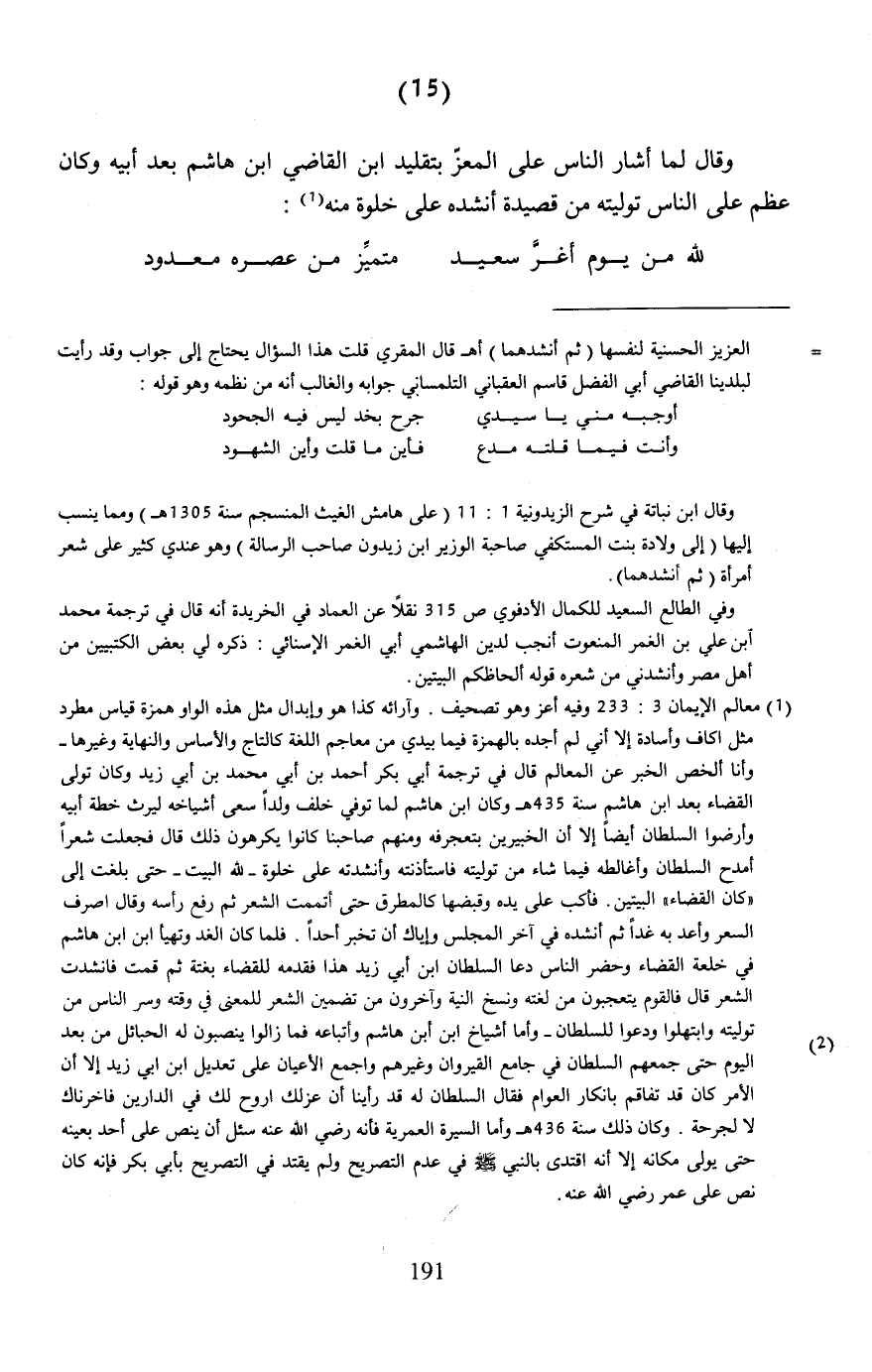 (¬1) معالم الإيمان 3: 233 وفيه أعز وهو تصحيف. وآرائه كذا هو وإبدال مثل هذه الواو همزة قياس مطرد مثل أكاف وأسادة إلا أني لم أجده بالهمزة فيما بيدي من معاجم اللغة كالتاج والأساس والنهاية وغيرها - وأنا ألخص الخبر عن المعالم قال في ترجمة أبي بكر أحمد بن أبي محمد بن أبي زيد وكان تولى القضاء بعد ابن هاشم سنة 435 هـ وكان ابن هاشم لما توفي خلف ولدًا سعى أشياخه ليرث خطة أبيه وأرضوا السلطان أيضًا إلا أن الخبيرين بتعجرفه ومنهم صاحبنا كانوا يكرهون ذلك قال فجعلت شعرًا أمدح السلطان وأغالطه فيما شاء من توليته فاستأذنته وأنشدته على خلوة -لله البيت- حتى بلغت إلى "كان القضاء" البيتين. فأكب على يده وقبضها كالمطرق حتى أتممت الشعر ثم رفع رأسه وقال اصرف السعر وأعد به غدًا ثم أنشده في آخر المجلس وإياك أن تخبر أحدًا. فلما كان الغد وتهيأ ابن ابن هاشم في خلعة القضاء وحضر الناس دعا السلطان ابن أبي زيد هذا فقدمه للقضاء بغتة ثم قمت فأنشدت الشعر قال فالقوم يتعجبون من لغته ونسخ النية وآخرون من تضمين الشعر للمعنى في وقته وسر الناس من توليته وابتهلوا ودعوا للسلطان -وأما أشياخ ابن ابن هاشم وأتباعه فما زالوا ينصبون له الحبائل من بعد اليوم حتى جمعهم السلطان في جامع القيروان وغيرهم واجمع الأعيان على تعديل ابن أبي زيد إلا أن الأمر كان قد تفاقم بإنكار العوام فقال السلطان له قد رأينا أن عزلك اروح لك في الدارين فأخرناك لا لجرحة. وكان ذلك سنة 436 هـ وأما السيرة العمرية فإنه رضي الله عنه سئل أن ينص على أحد بعينه حتى يولى مكانه إلا أنه اقتدى بالنبي - صلى الله عليه وسلم - في عدم التصريح ولم يقتد في التصريح بأبي بكر فإنه كان نص على عمر رضي الله عنه.