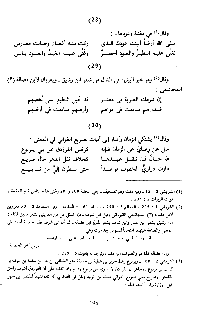(¬2) الشريشي 1: 205، المعالم 3: 240، البساط 61، = المقامة، وفي المعاهد 2: 70 معزوين لابن فضالة (؟) المجاشعي القيرواني وقيل ابن شرف -فإذا تمثل كل من القرينين بشعر سابق قائله: ابن رشيق بشعر ابن عمار وابن شرف بشعر بلديّهِ ابن فضالة- ثم أن ابن شرف نظم خمسة أبيات في المعنى والصنعة عينهما امتحانًا للسوس وقد مرت وهي: