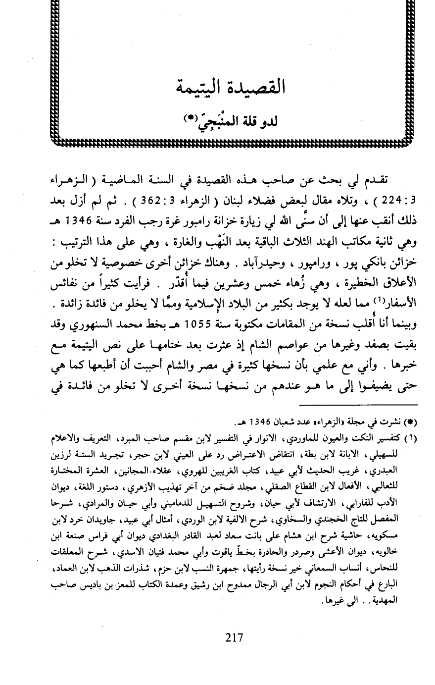 تقدم لي بحث عن صاحب هذه القصيدة في السنة الماضية (الزهراء 3: 224)، وتلاه مقال لبعض فضلاء لبنان (الزهراء 3: 362). ثم لم أزل بعد ذلك أنقب عنها إلى أن سنَّى الله لي زيارة خزانة رامبور غرة رجب الفرد سنة 1346 هـ وهي ثانية مكاتب الهند الثلاث الباقية بعد النَهْب والغارة، وهي على هذا الترتيب: خزائن بانكي بور، ورامبور، وحيدرآباد. وهناك خزائن أخرى خصوصية لا تخلو من الأعلاق الخطيرة، وهي زُهاء خمس وعشرين فيما أُقدّر. فرأيت كثيرًا من نفائس الأسفار (¬1) مما لعله لا يوجد بكثير من البلاد الإِسلامية وممَّا لا يخلو من فائدة زائدة. وبينما أنا أُقلب نسخة من المقامات مكتوبة سنة 1055 هـ بخط محمد السنهوري وقد بقيت بصفد وكيرها من عواصم الشام إذ عثرت بعد ختامها على نص اليتيمة مع خبرها. وأني مع علمي بأن نسخها كثيرة في مصر والشام أحببت أن أطبعها كما هي حتى يضيفوا إلى ما هو عندهم من نسخها نسخة أخرى لا تخلو من فائدة في