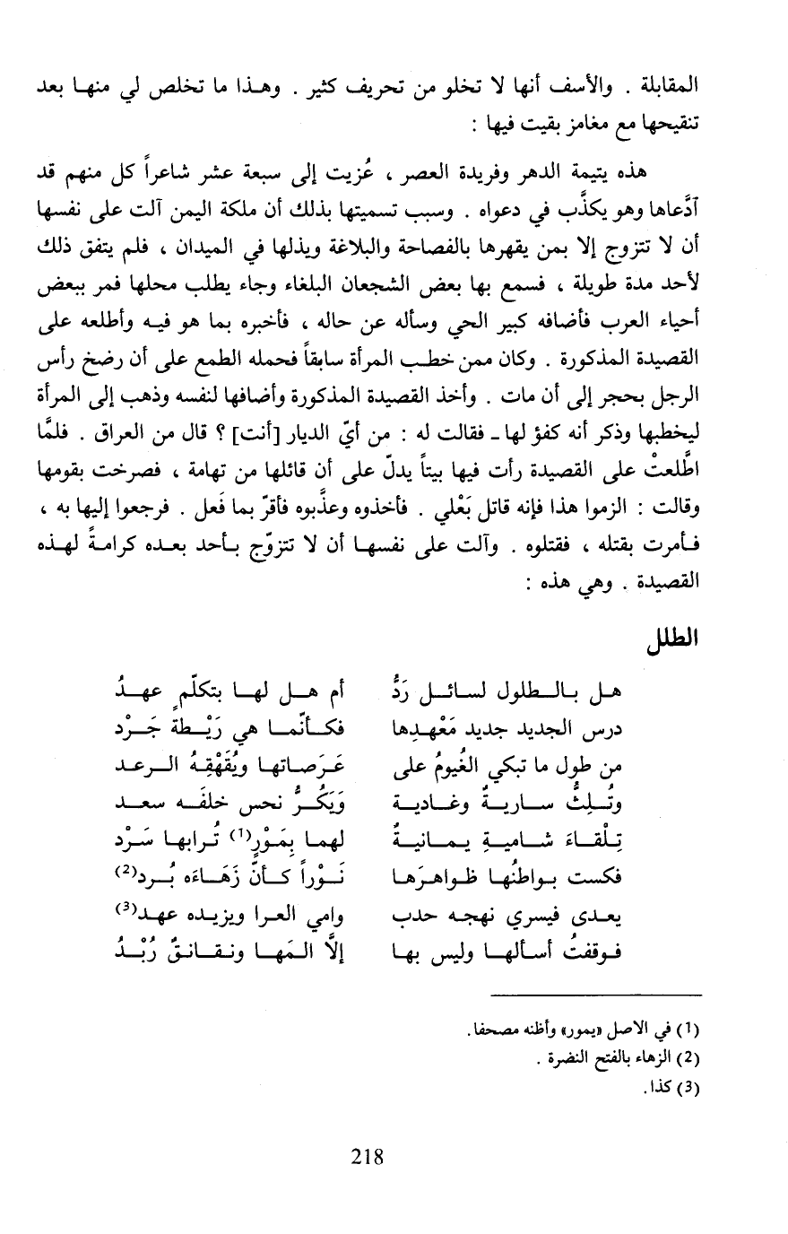 هذه يتيمة الدهر وفريدة العصر، غزيت إلى سبعة عشر شاعرًا كل منهم قد ادَّعاها وهو يكذَّب في دعواه. وسبب تسميتها بذلك أن ملكة اليمن آلت على نفسها أن لا تتزوج إلا بمن يقهرها بالفصاحة والبلاغة ويذلها في الميدان، فلم يتفق ذلك لأحد مدة طويلة، فسمع بها بعض الشجعان البلغاء وجاء يطلب محلها فمر ببعض أحياء العرب فأضافه كبير الحي وسأله عن حاله، فأخبره بما هو فيه وأطلعه على القصيدة المذكورة. وكان ممن خطب المرأة سابقًا فحمله الطمع على أن رضخ رأس الرجل بحجر إلى أن مات. وأخذ القصيدة المذكورة وأضافها لنفسه وذهب إلى المرأة ليخطبها وذكر أنه كفؤ لها - فقالت له: من أيّ الديار [أنت]؟ قال من العراق. فلمَّا اطَّلعتْ على القصيدة رأت فيها بيتًا يدلّ على أن قائلها من تهامة، فصرخت بقومها وقالت: الزموا هذا فإنه قاتل بَعْلي. فأخذوه وعذَّبوه فأقرّ بما فَعل. فرجعوا إليها به، فأمرت بقتله، فقتلوه. وآلت على نفسها أن لا تتزوّج بأحد بعده كرامةً لهذه القصيدة، وهي هذه: