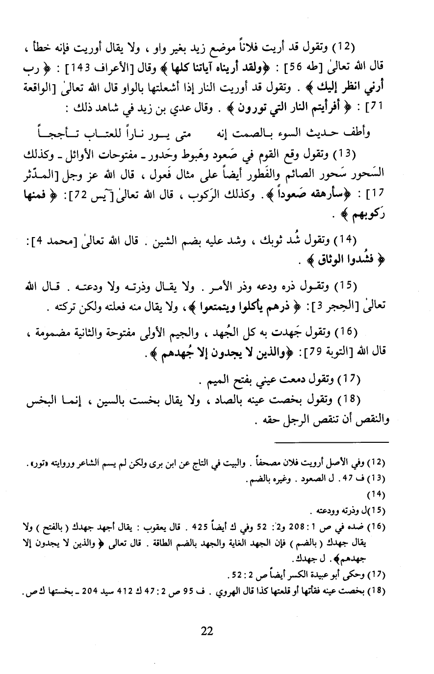 (12) وتقول قد أريت فلانًا موضع زيد بغير واو، ولا يقال أوريت فإنه خطأ، قال الله تعالى [طه 56]: {وَلَقَدْ أَرَينَاهُ آيَاتِنَا كُلَّهَا} وقال [الأعراف 143]: {رَبِّ أَرِنِي أَنْظُرْ إِلَيكَ}. وتقول قد أوريت النار إذا أشعلتها بالواو قال الله تعالى [الواقعة 71]: {أَفَرَأَيتُمُ النَّارَ الَّتِي تُورُونَ}. وقال عدي بن زيد في شاهد ذلك: