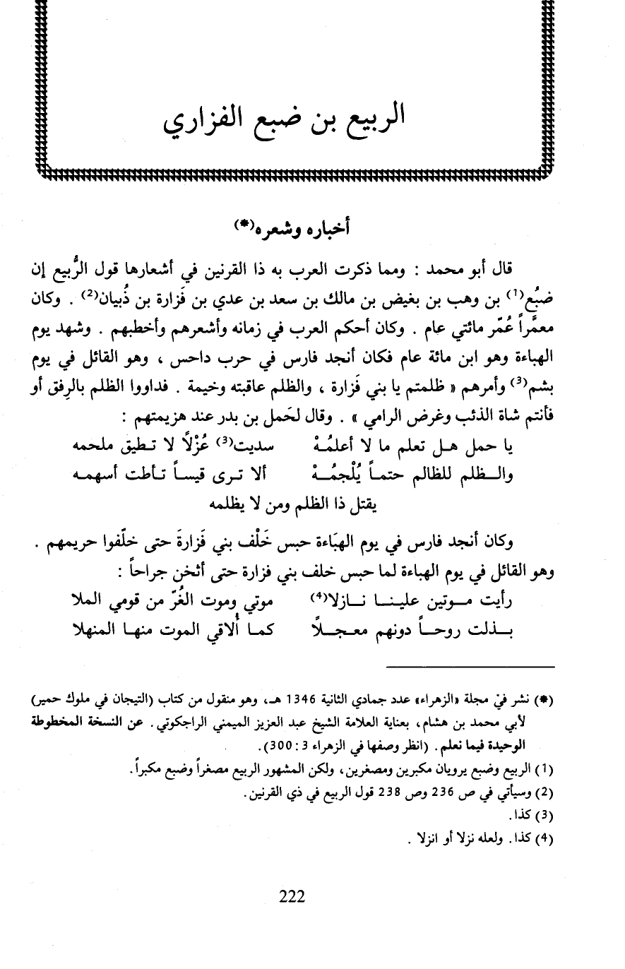 (*) نشر في مجلة "الزهراء" عدد جمادي الثانية 1346 هـ، وهو منقول من كتاب (التيجان في ملوك حمير) لأبي محمد بن هشام، بعناية العلامة الشيخ عبد العزيز الميمني الراجكوتي. عن النسخة المخطوطة الوحيدة فيما نعلم. (انظر وصفها في الزهراء 3: 300).