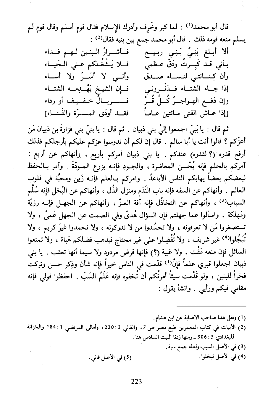 قال أبو محمد (¬1): لما كبر وخَرِف وأدرك الإِسلام فقال قوم أسلم وقال قوم لم يسلم منعه قومه ذلك. قال أبو محمد جمع بين بنيه فقال (¬2):