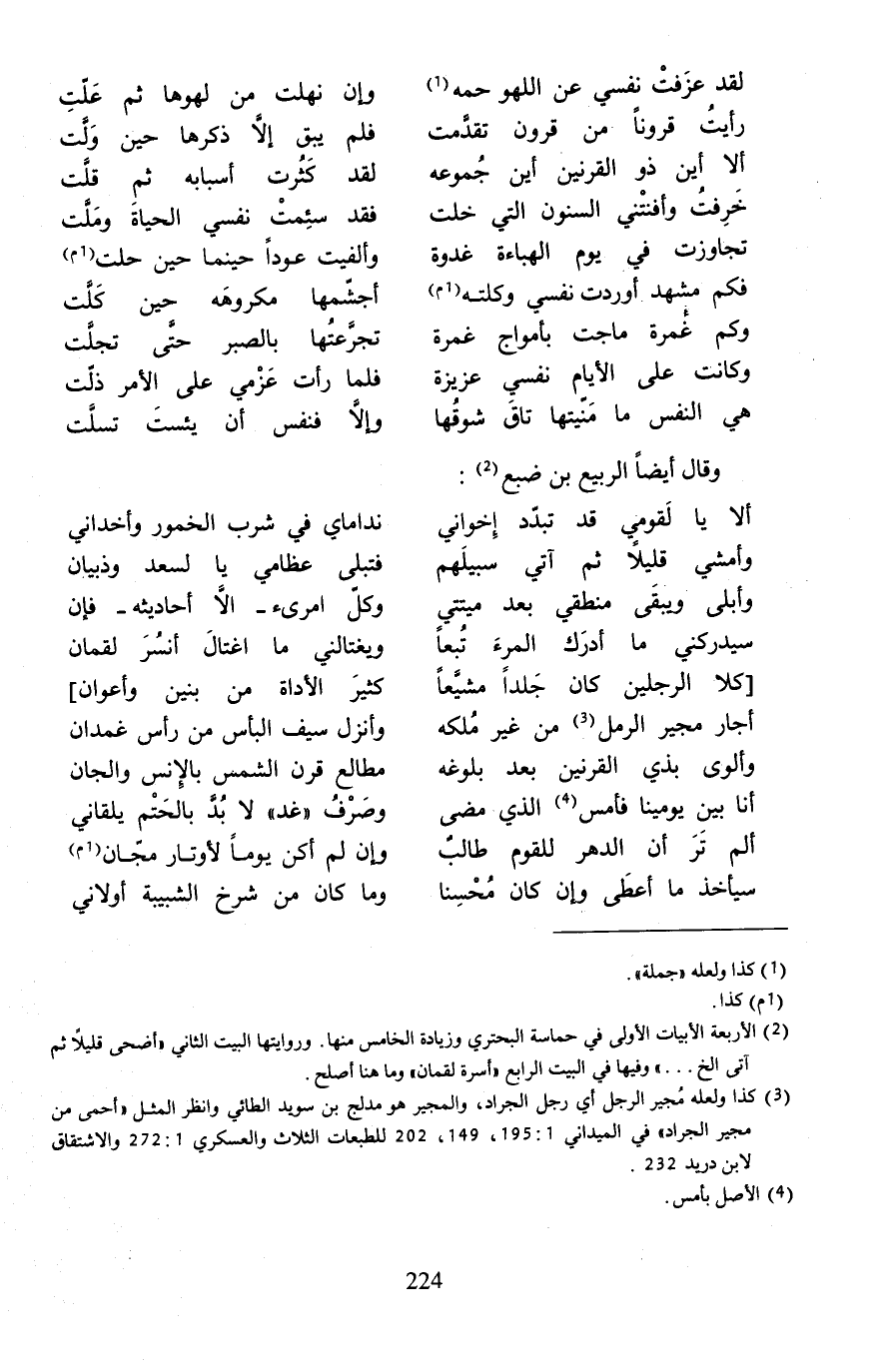 (¬2) الأربعة الأبيات الأولى في حماسة البحتري وزيادة الخامس منها. وروايتها البيت الثاني "أضحى قليلًا ثم آتى الخ ... " وفيها في البيت الرابع "أسرة لقمان" وما هنا أصلح.